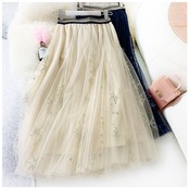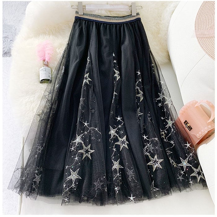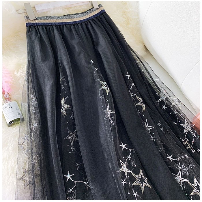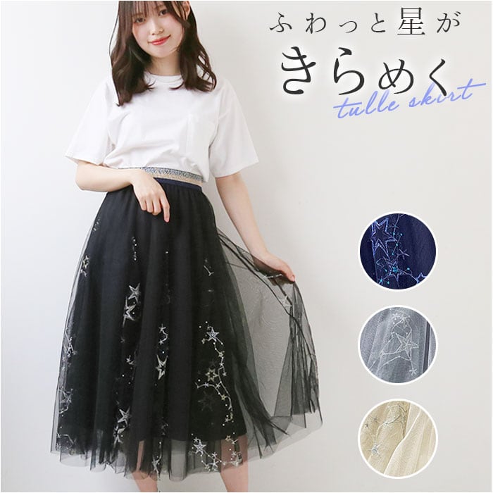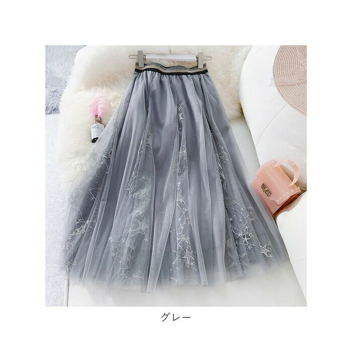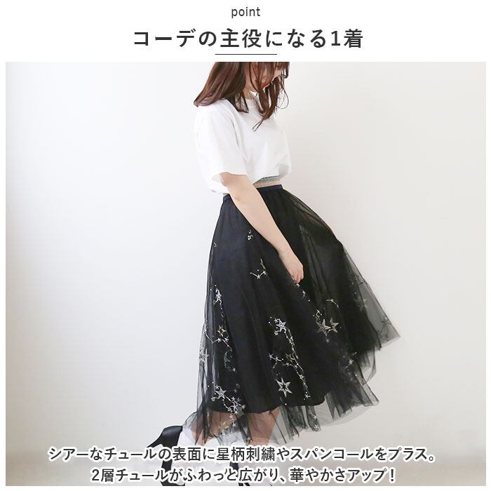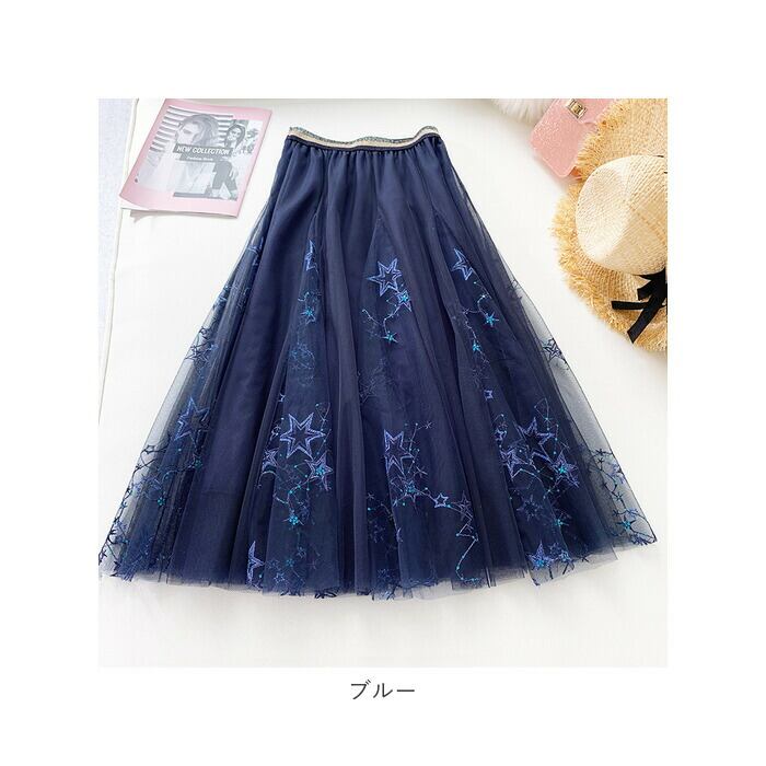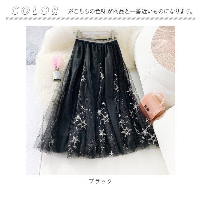 チュールスカート ロング 通販 スカート チュール レディース 春 夏 ロングスカート フレアスカート マキシ フレア ウエストゴム ミモレ丈 刺繍 星 キラキラ ボリューム ゆったり 動きやすい フレアースカート ボトムス レディースファッション