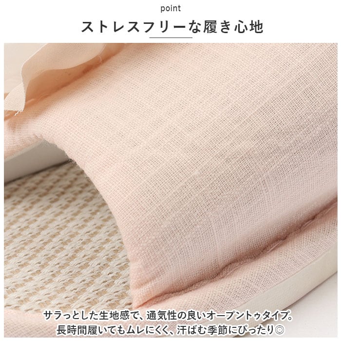 ・サラっとした生地感で、通気性の良いオープントゥタイプ。長時間履いてもムレにくく、汗ばむ季節にぴったり◎