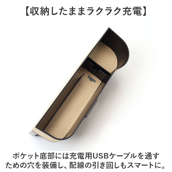 ・ポケット底部には充電用USBケーブルを通すための穴を装備し、配線の引き回しもスマートに。