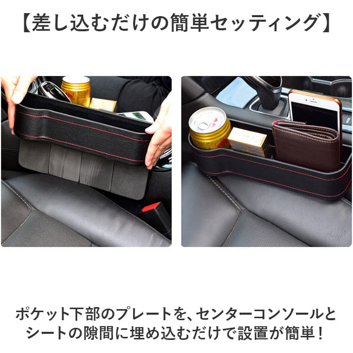 ・ポケット下部のプレートを、センターコンソールとシートの隙間に埋め込むだけで設置が簡単!