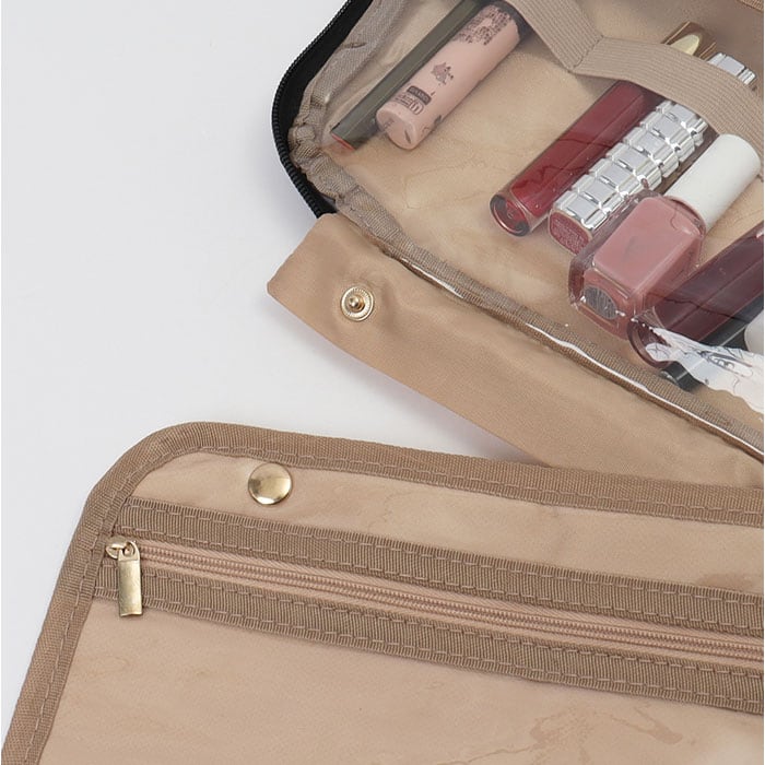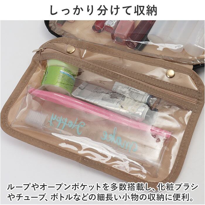 ・ループやオープンポケットを多数搭載し、化粧ブラシやチューブ、ボトルなどの細長い小物の収納に便利。