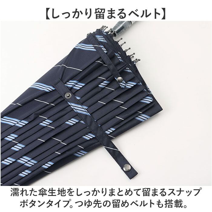 ・濡れた傘生地をしっかりまとめて留まるスナップボタンタイプ。つゆ先の留めベルトも搭載。