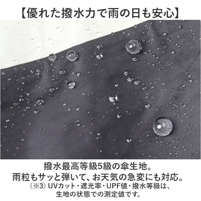 ・撥水最高等級5級の傘生地。雨粒もサッと弾いて、お天気の急変にも対応。