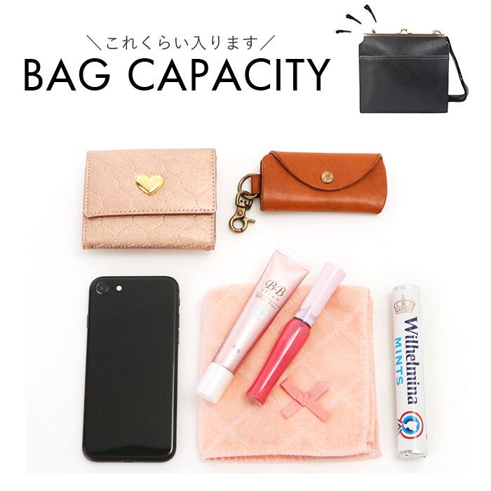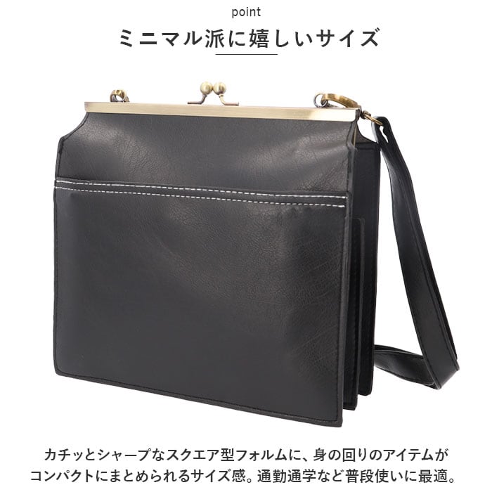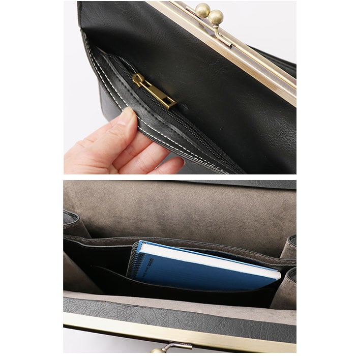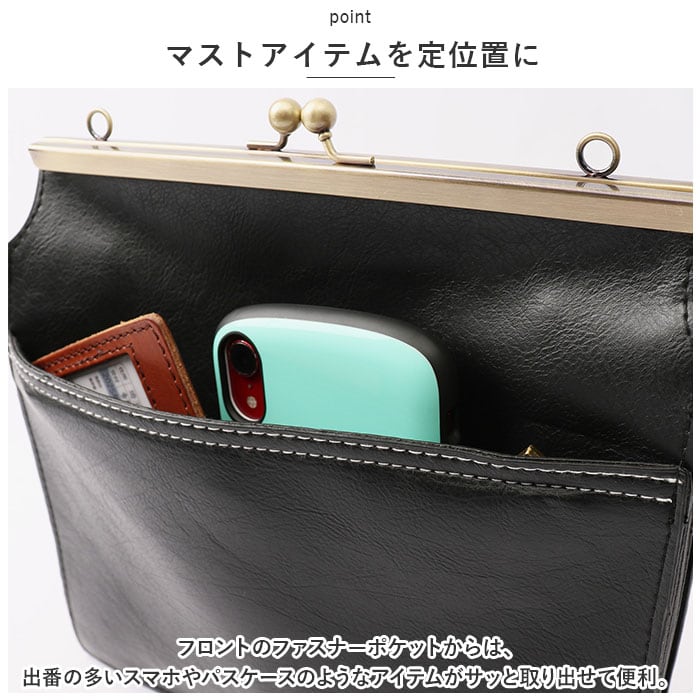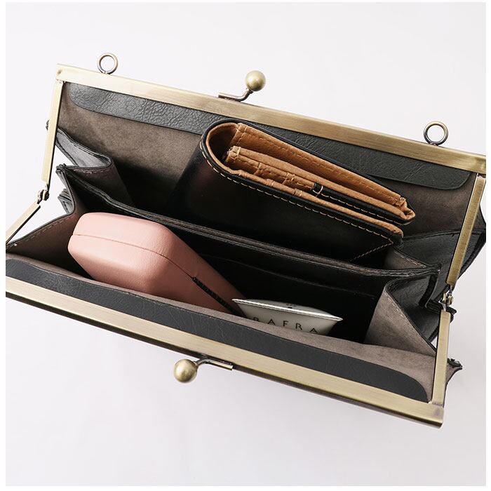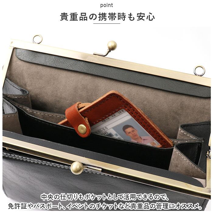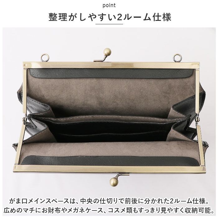 ・がま口メインスペースは、中央の仕切りで前後に分かれた2ルーム仕様。広めのマチにお財布やメガネケース、コスメ類もすっきり見やすく収納可能。
