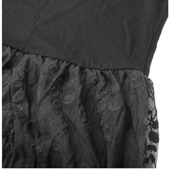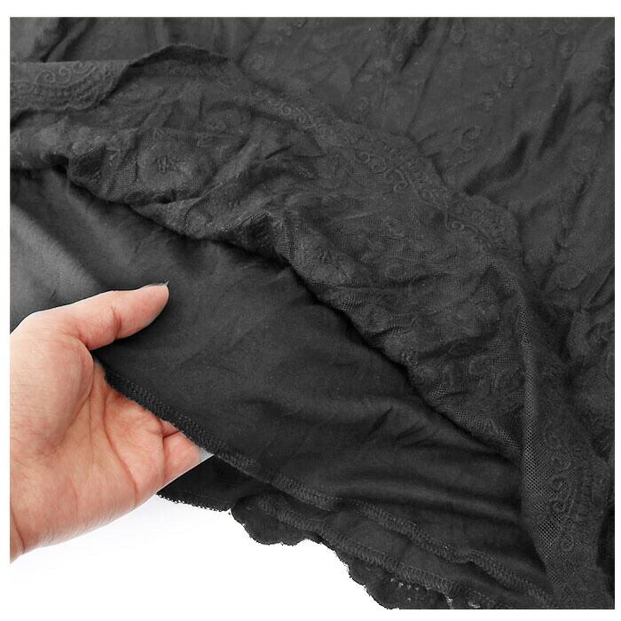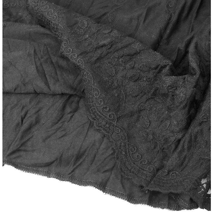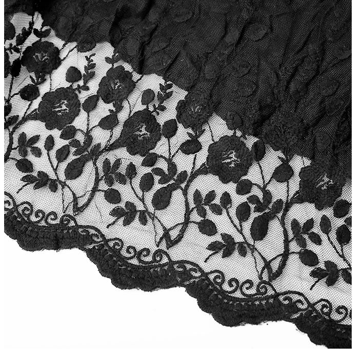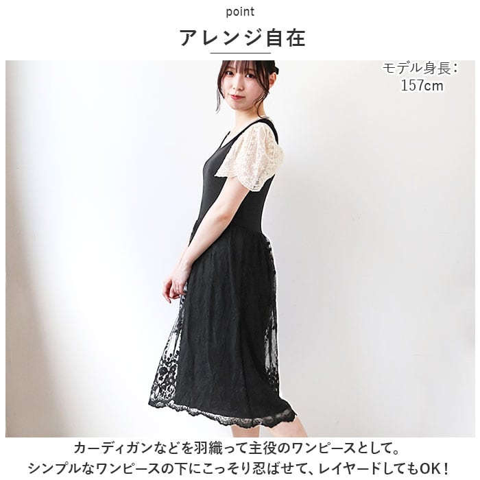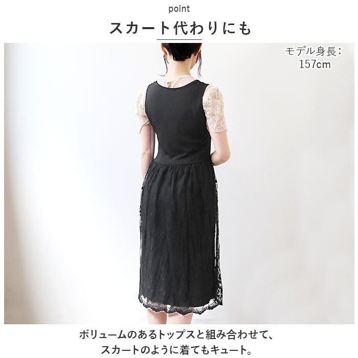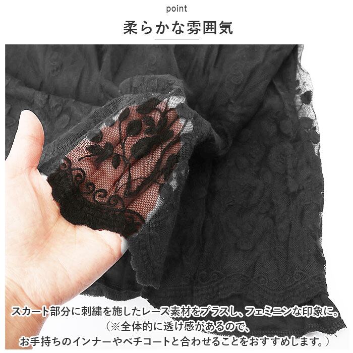 ・スカート部分に刺繍を施したレース素材をプラスし、フェミニンな印象に。(※全体的に透け感があるので、お手持ちのインナーやペチコートと合わせることをおすすめします。)