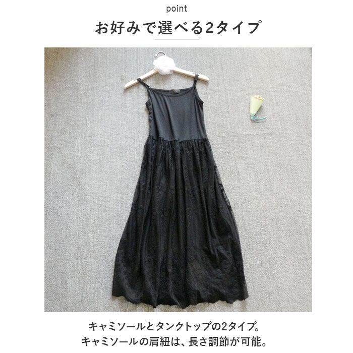 ・キャミソールとタンクトップの2タイプ。キャミソールの肩紐は、長さ調節が可能。