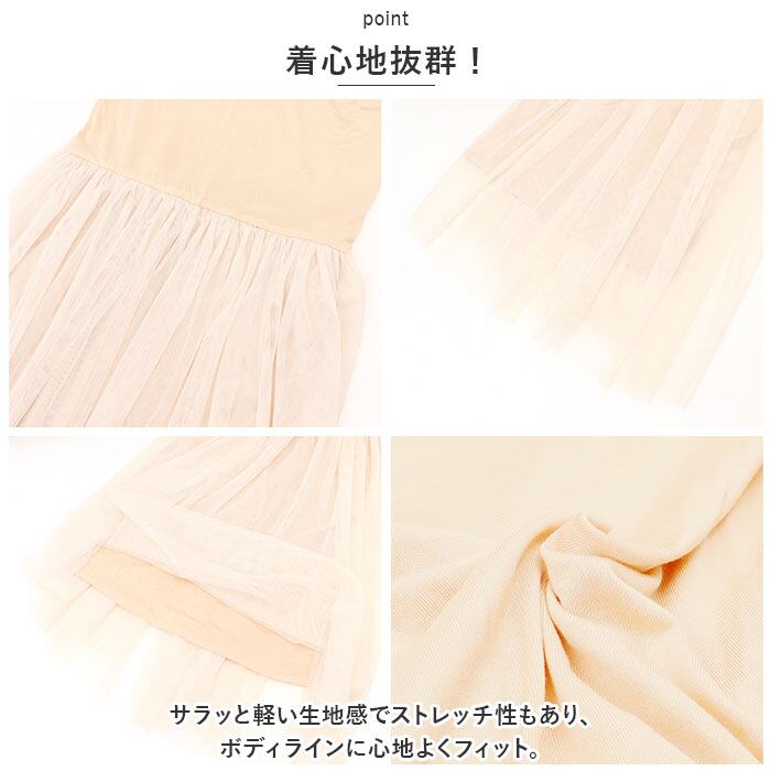 ・スカート部分にチュール素材をプラスし、フェミニンな印象に。(※透け感があるので、お手持ちのインナーやペチコートなどと合わせることをおすすめします。)