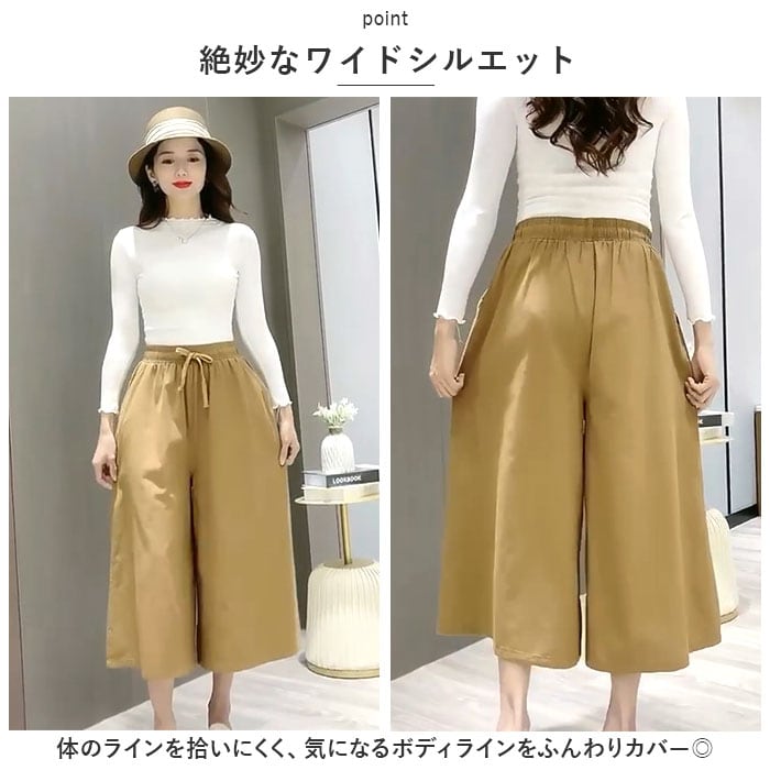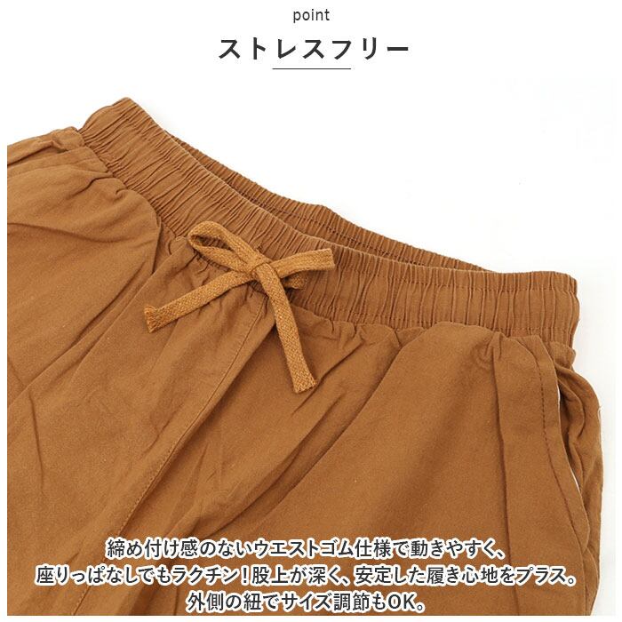 ・締め付け感のないウエストゴム仕様で動きやすく、座りっぱなしでもラクチン!股上が深く、安定した履き心地をプラス。外側の紐でサイズ調節もOK。