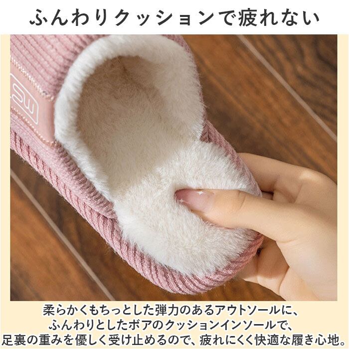 ・柔らかくもちっとした弾力のあるアウトソールに、ふんわりとしたボアのクッションインソールで、足裏の重みを優しく受け止めるので、疲れにくく快適な履き心地。