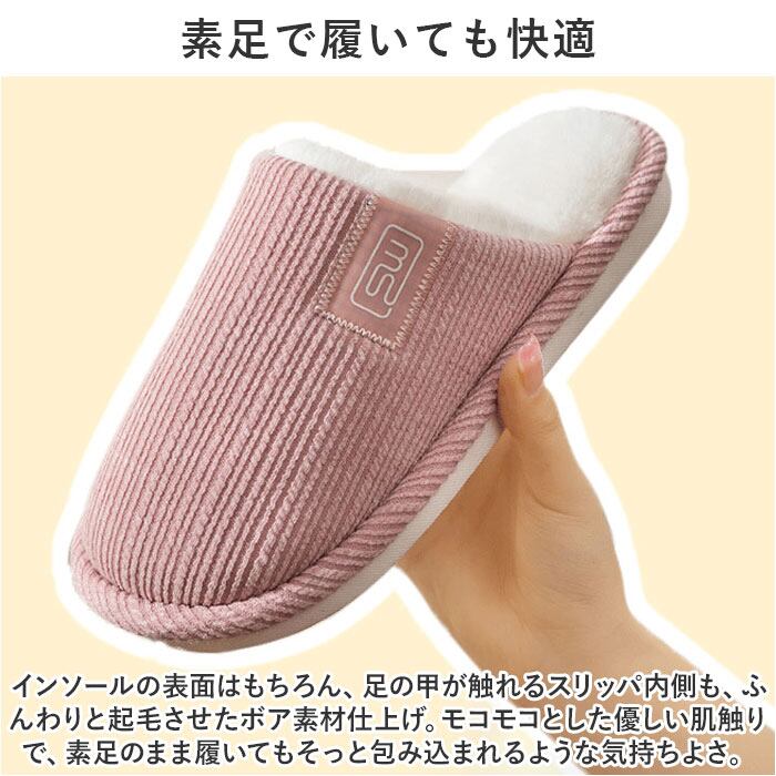 ・インソールの表面はもちろん、足の甲が触れるスリッパ内側も、ふんわりと起毛させたボア素材仕上げ。モコモコとした優しい肌触りで、素足のまま履いてもそっと包み込まれるような気持ちよさ。
