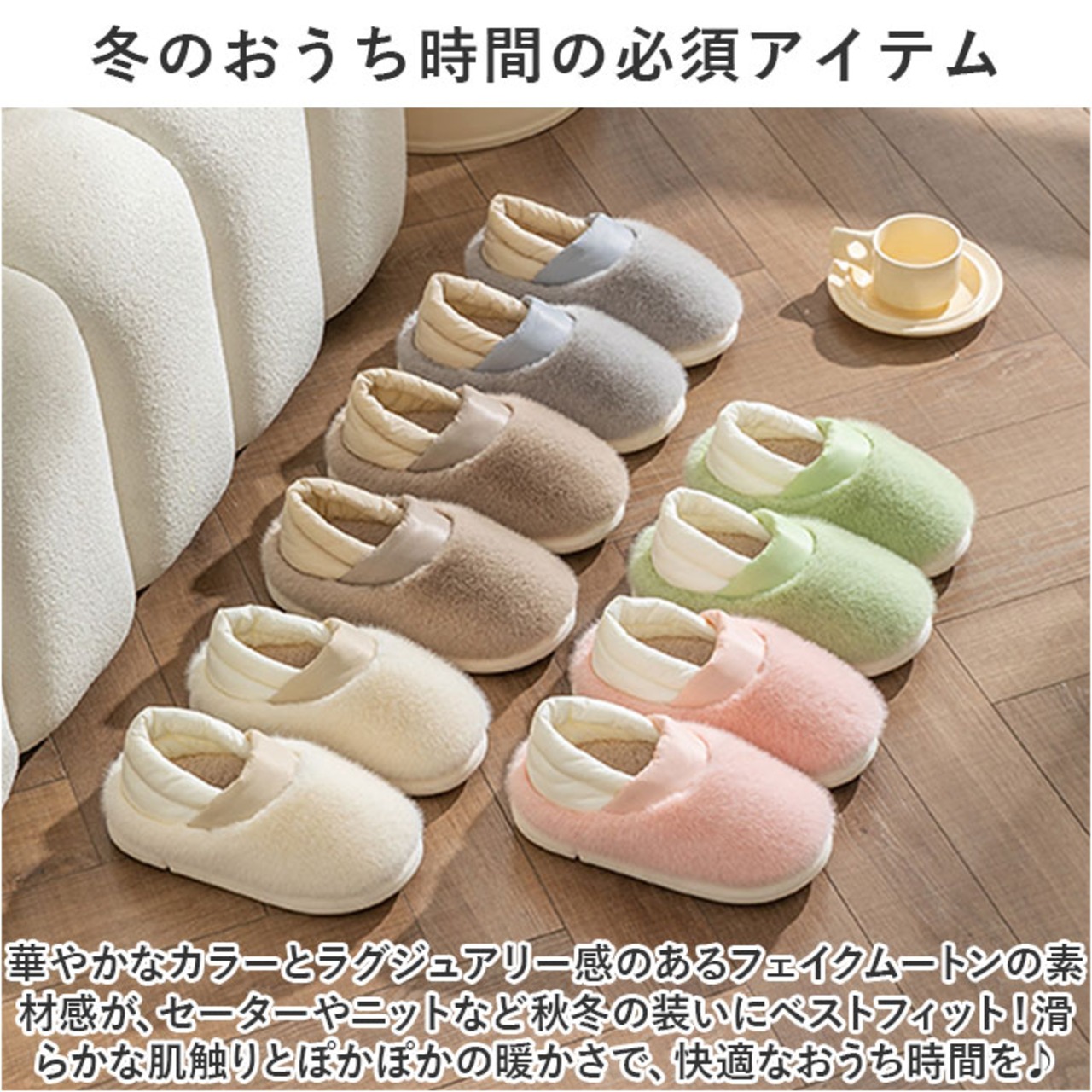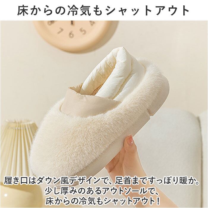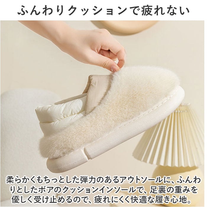 ・履き口はダウン風デザインで、足首まですっぽり暖か。少し厚みのあるアウトソールで、床からの冷気もシャットアウト!