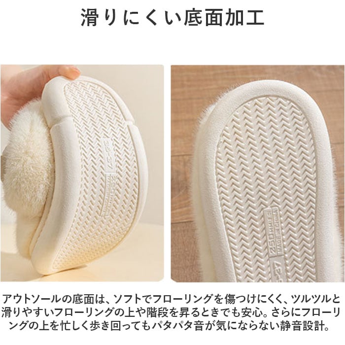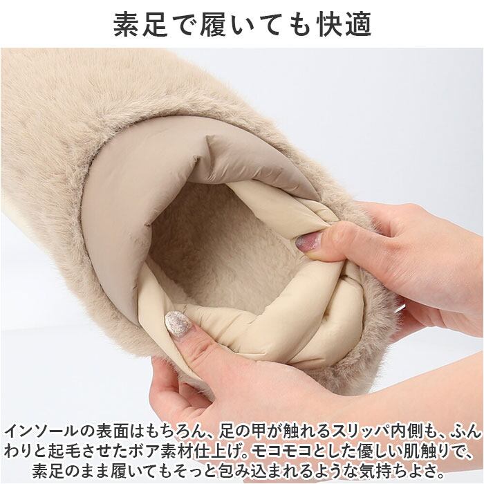 ・インソールの表面はもちろん、足の甲が触れるスリッパ内側も、ふんわりと起毛させたボア素材仕上げ。モコモコとした優しい肌触りで、素足のまま履いてもそっと包み込まれるような気持ちよさ。
