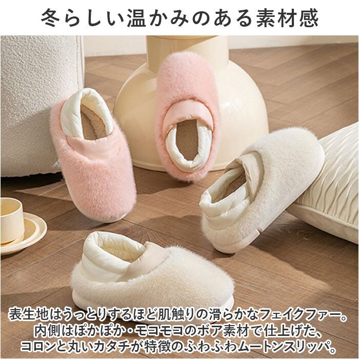 ・柔らかくもちっとした弾力のあるアウトソールに、ふんわりとしたボアのクッションインソールで、足裏の重みを優しく受け止めるので、疲れにくく快適な履き心地。