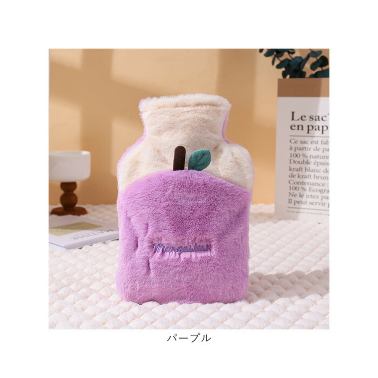 ・心がほっこりするふんわり素材に、フルーツモチーフをプラスしたカバー付き。