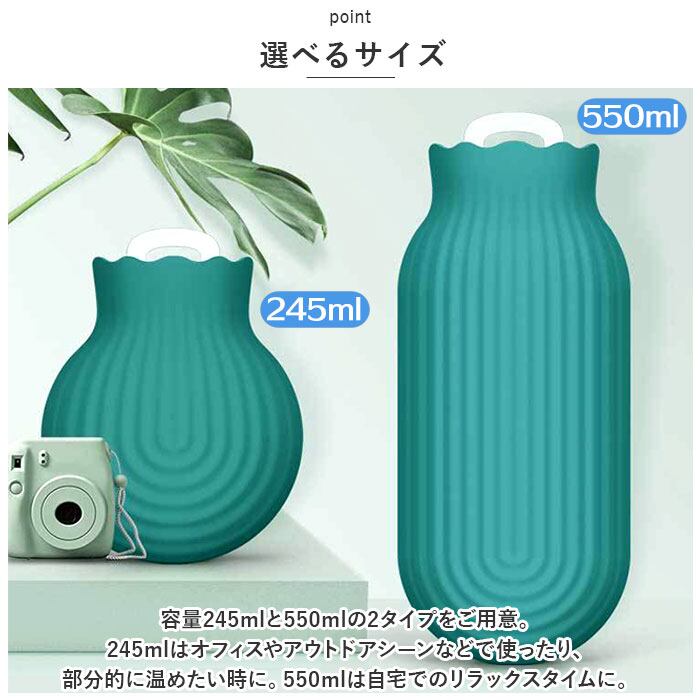 ・容量245mlと550mlの2タイプをご用意。245mlはオフィスやアウトドアシーンなどで使ったり、部分的に温めたい時に。550mlは自宅でのリラックスタイムに。