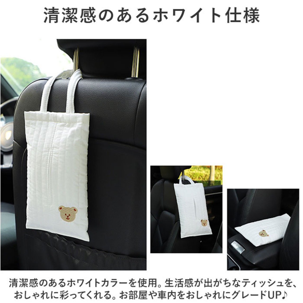 ・清潔感のあるホワイトカラーを使用。生活感が出がちなティッシュを、おしゃれに彩ってくれる。お部屋や車内をおしゃれにグレードUP♪