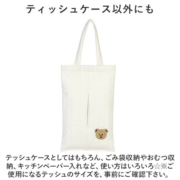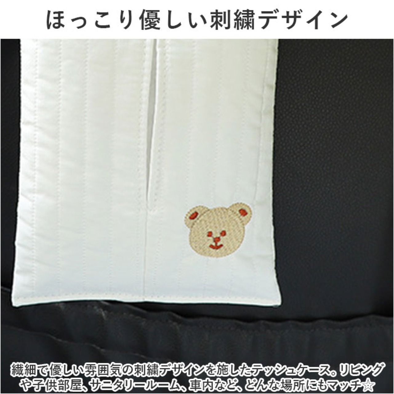 ・繊細で優しい雰囲気の刺繍デザインを施したテッシュケース。リビングや子供部屋、サニタリールーム、車内など、どんな場所にもマッチ☆