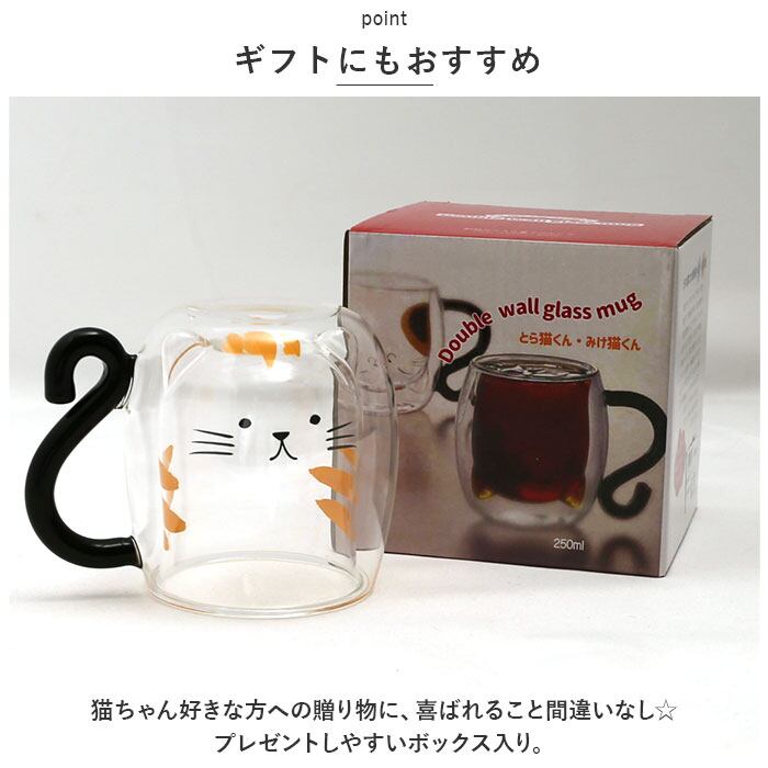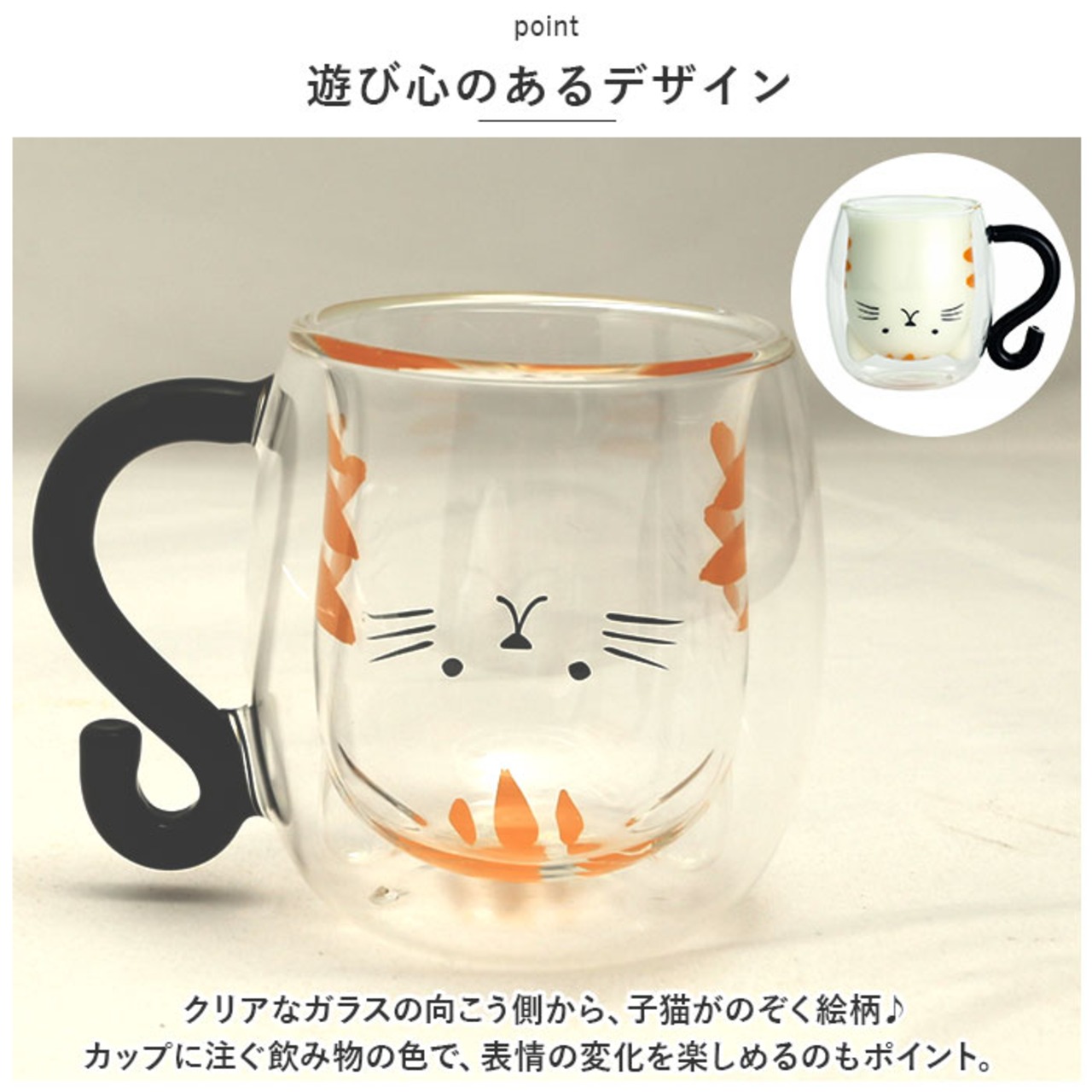 ・クリアなガラスの向こう側から、子猫がのぞく絵柄♪カップに注ぐ飲み物の色で、表情の変化を楽しめるのもポイント。