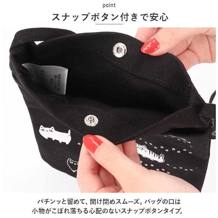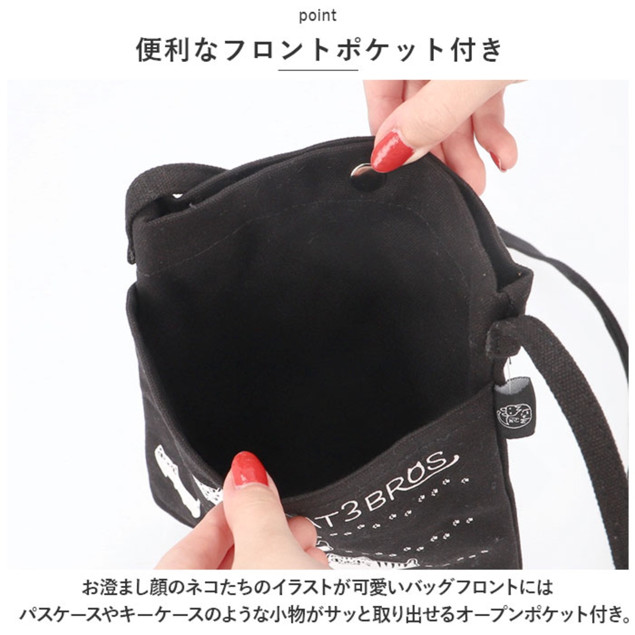 ・お澄まし顔のネコたちのイラストが可愛いバッグフロントには、パスケースやキーケースのような小物がサッと取り出せるオープンポケット付き。