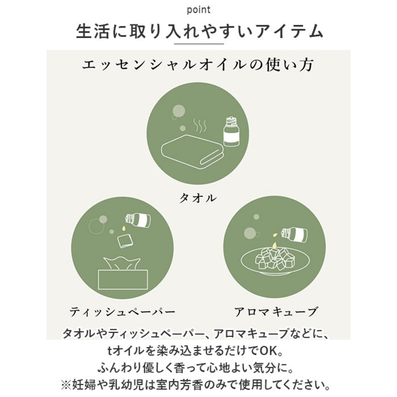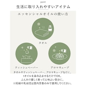 ・タオルやティッシュペーパー、アロマキューブなどに、オイルを染み込ませるだけでOK。ふんわり優しく香って心地よい気分に。(※妊婦や乳幼児は室内芳香のみで使用してください。)