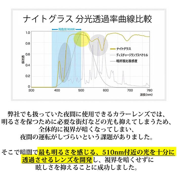 ・対向車のライトなどのまぶしい光を抑えつつ、明るさをしっかりと確保。暗闇で最も明るさを感じる、510nm付近の光を十分に透過させるレンズを開発し、視界を暗くせずに眩しさを抑えることに成功。
