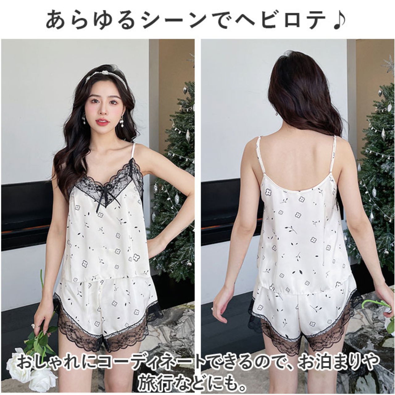 ・キャミソールとショートパンツの2点セット。お風呂上がりや、ゆったりくつろぎタイムもストレスフリー。