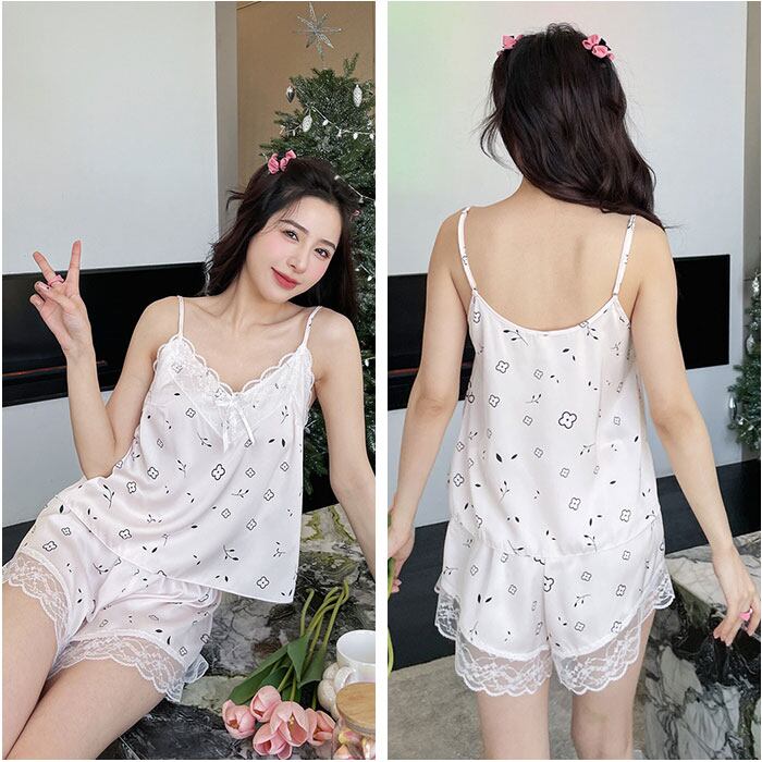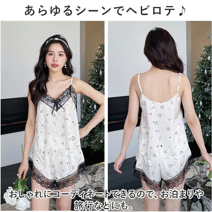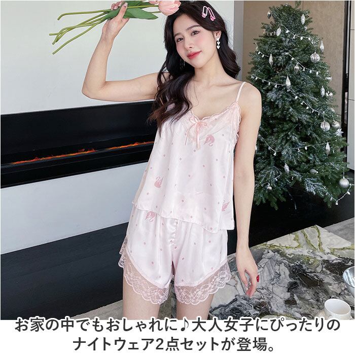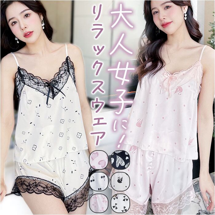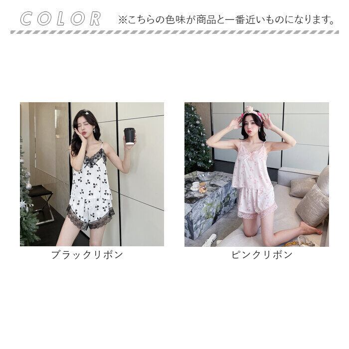 ルームウェア レディース おしゃれ 通販 パジャマ 部屋着 ナイトウェア 寝巻き ネグリジェ セットアップ 上下セット 2点セット キャミソール 半ズボン ショートパンツ レース リボン ウエストゴム 旅行 お泊り リラックス 春 夏 可愛い かわいい インナー