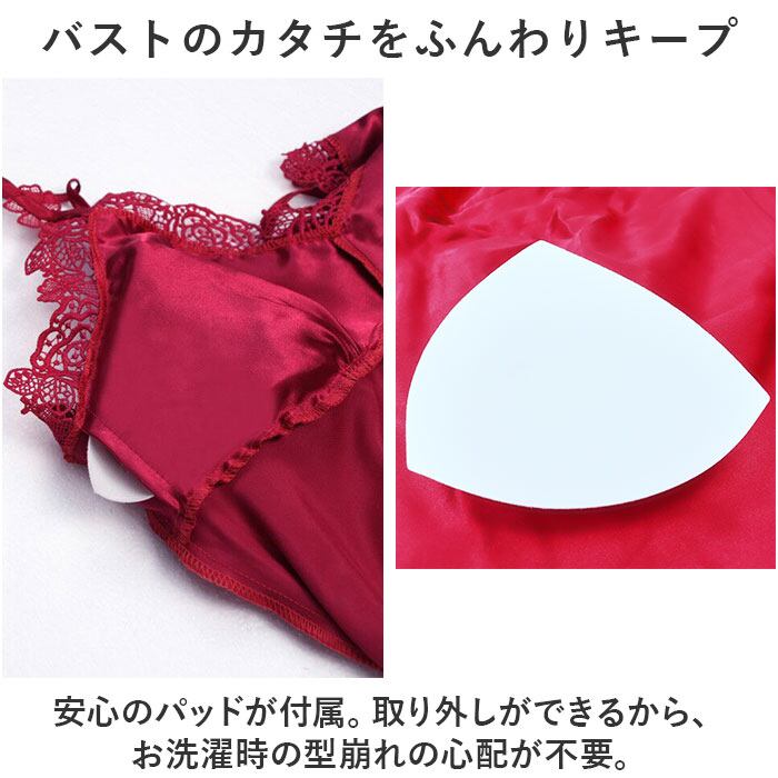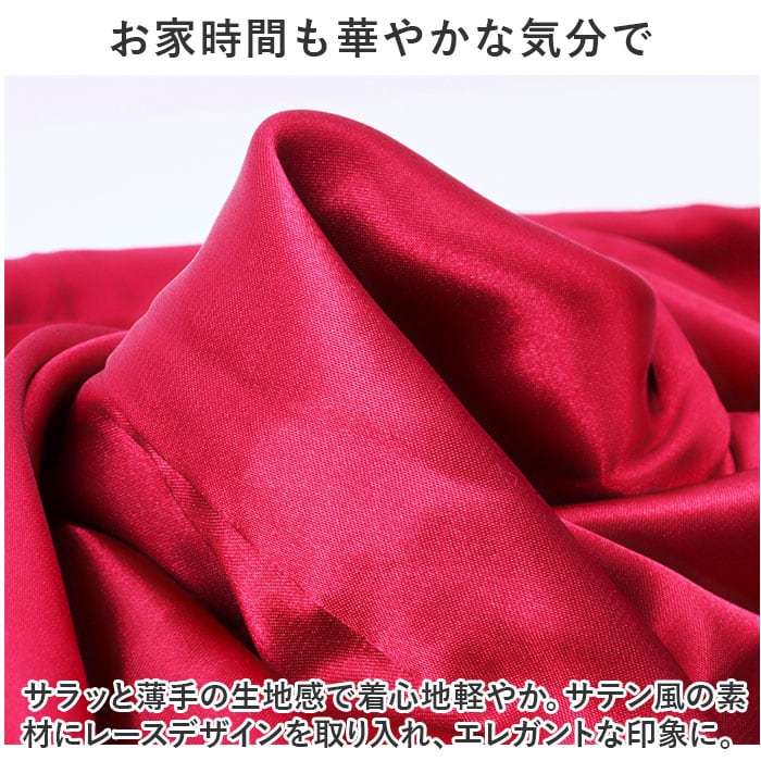・サラッと薄手の生地感で着心地軽やか。サテン風の素材にレースデザインを取り入れ、エレガントな印象に。