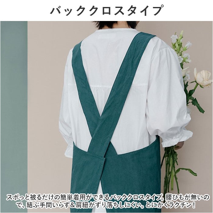 ・スポっと被るだけの簡単着用ができるバッククロスタイプ。腰ひもが無いので、結ぶ手間いらず&肩紐がずり落ちしにくい。とにかくラクチン!