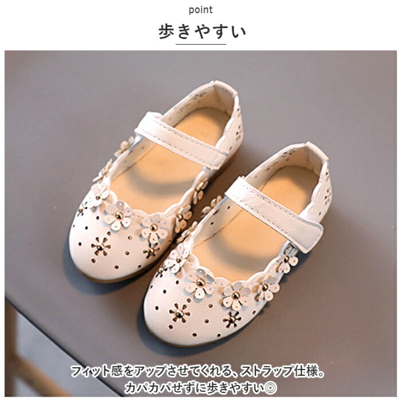 ・お子様が自分で履けるよう、ストラップには面ファスナーを採用。着脱が簡単なのでお出かけ先でもスムーズ☆