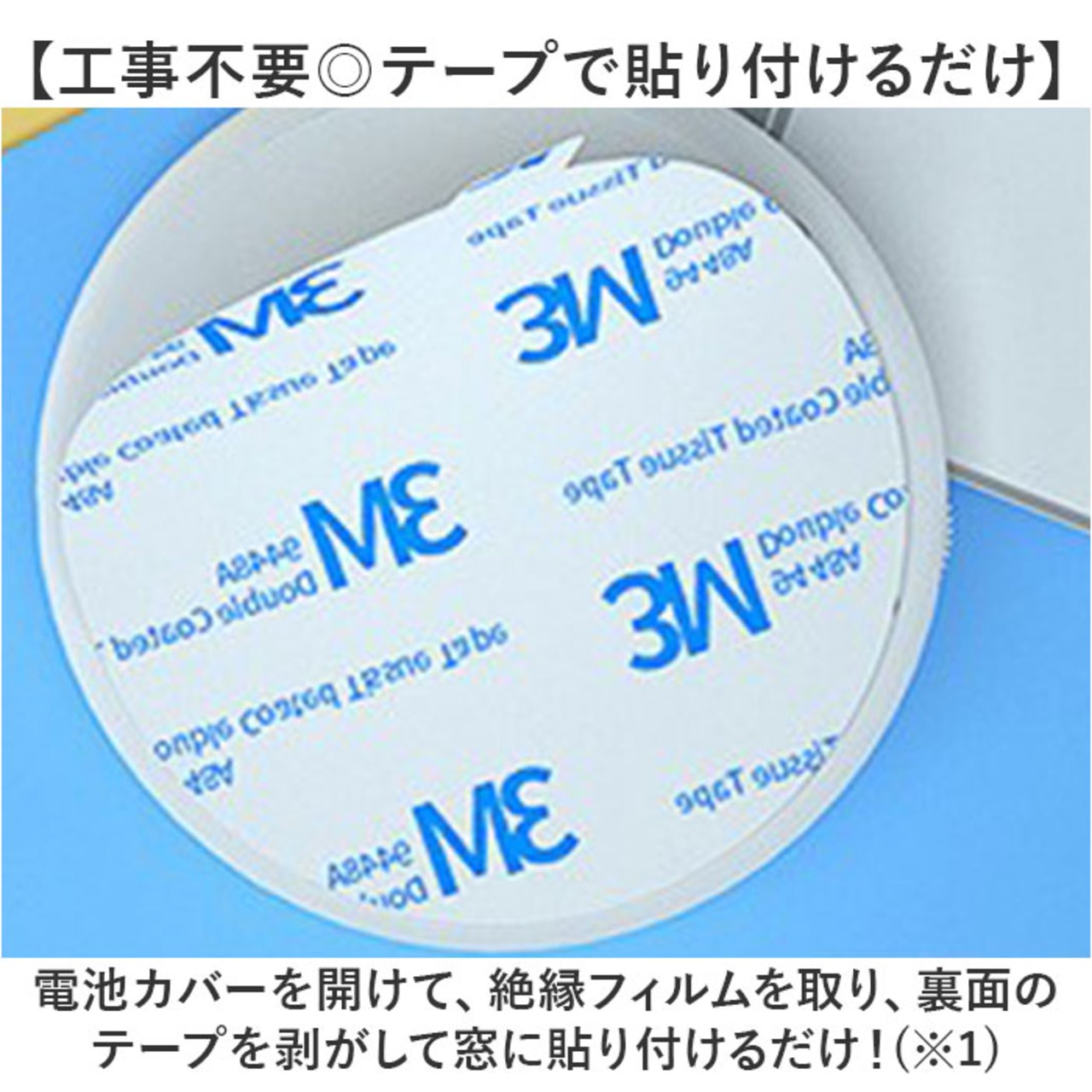 ・電池カバーを開けて、絶縁フィルムを取り、裏面のテープを剥がして窓に貼り付けるだけ!