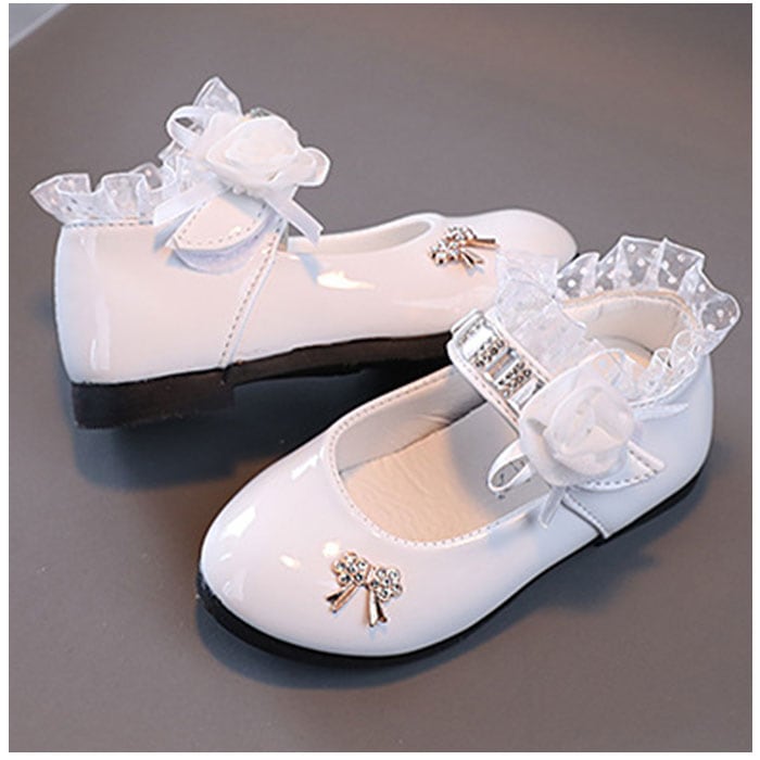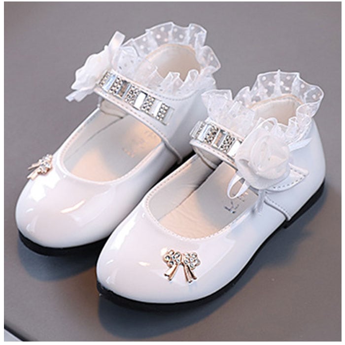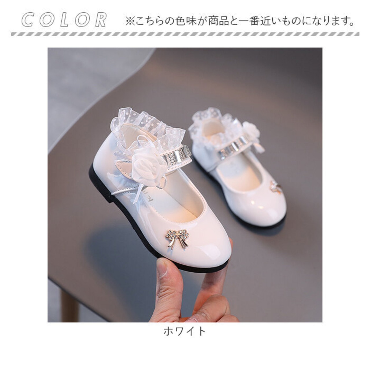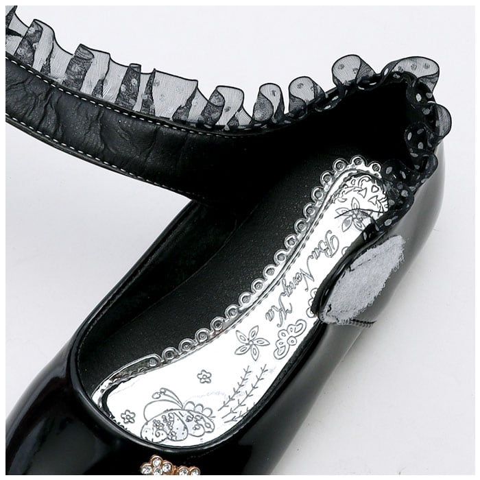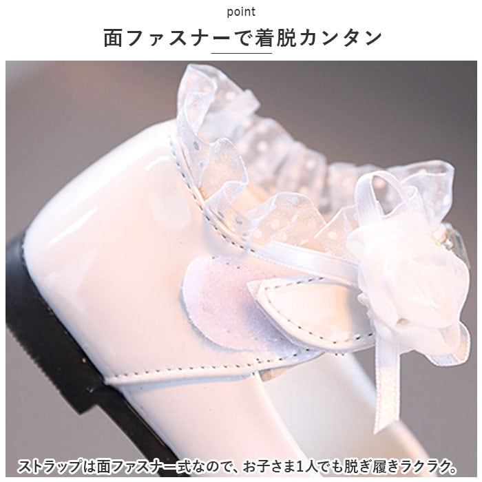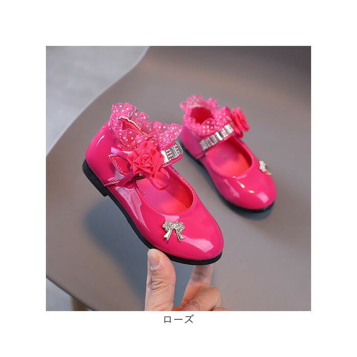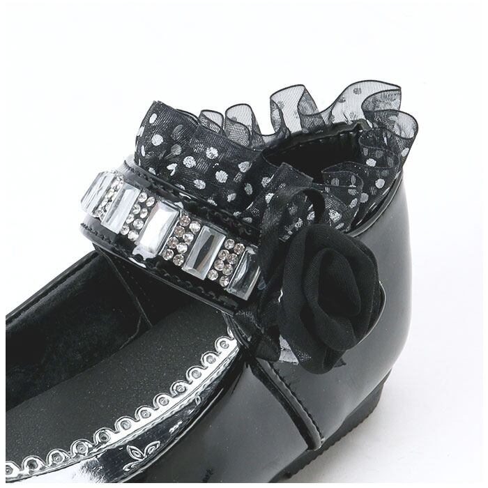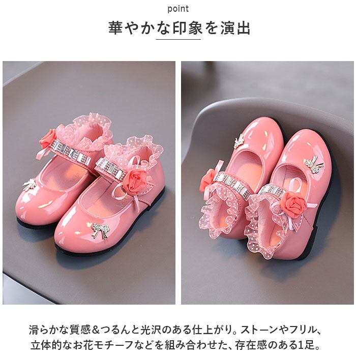 ・滑らかな質感&つるんと光沢のある仕上がり。ストーンやフリル、立体的なお花モチーフなどを組み合わせた、存在感のある1足。