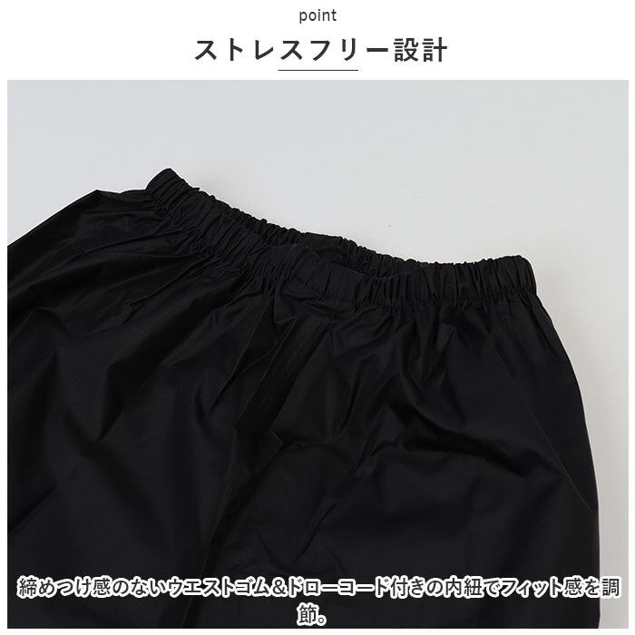 ・締めつけ感のないウエストゴム&ドローコード付きの内紐でフィット感を調節。
