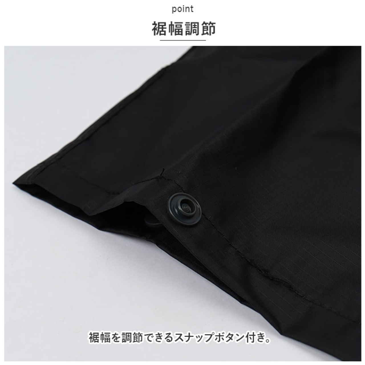 ・裾幅を調節できるスナップボタン付き。