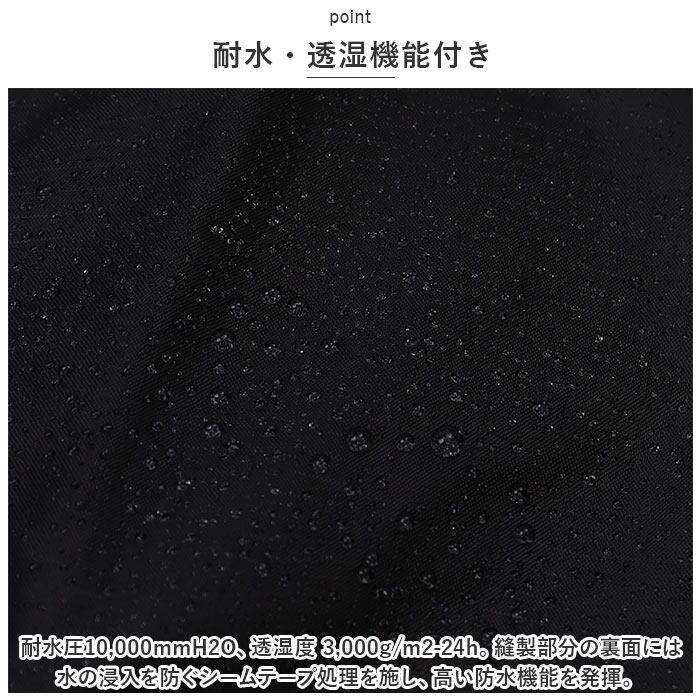 ・耐水圧10,000mmH2O、透湿度 3,000g/m2-24h。縫製部分の裏面には水の浸入を防ぐシームテープ処理を施し、高い防水機能を発揮。