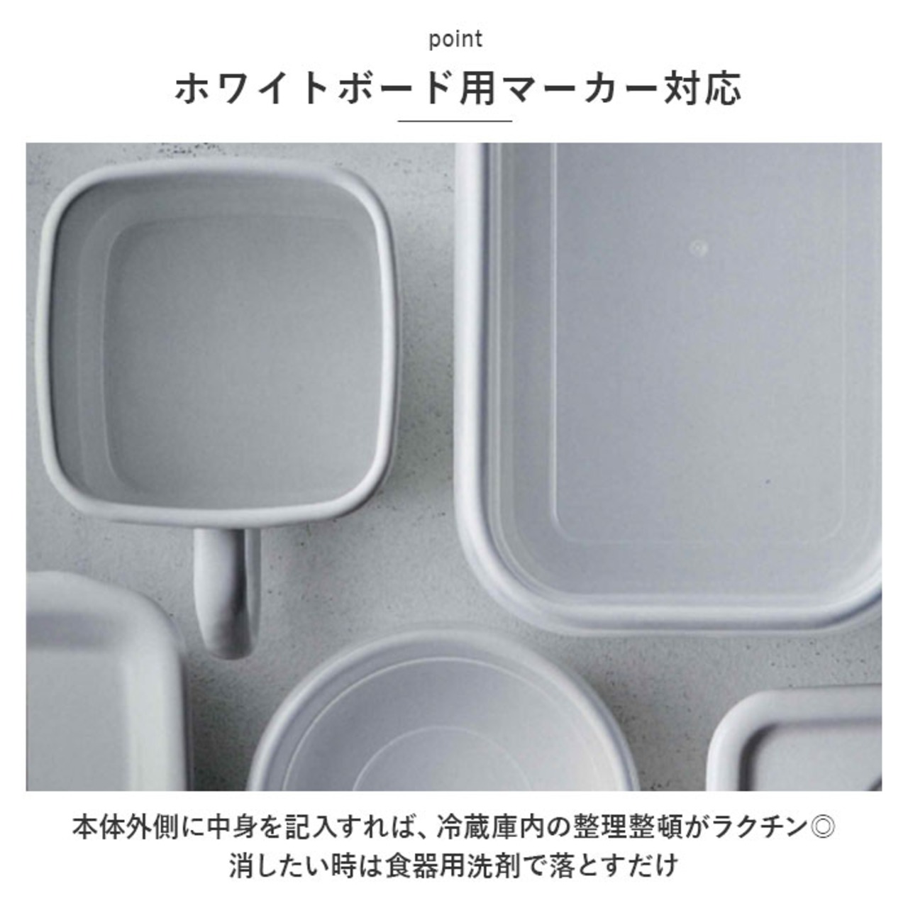 ・本体外側に中身を記入すれば、冷蔵庫内の整理整頓がラクチン◎消したい時は食器用洗剤で落とすだけ。