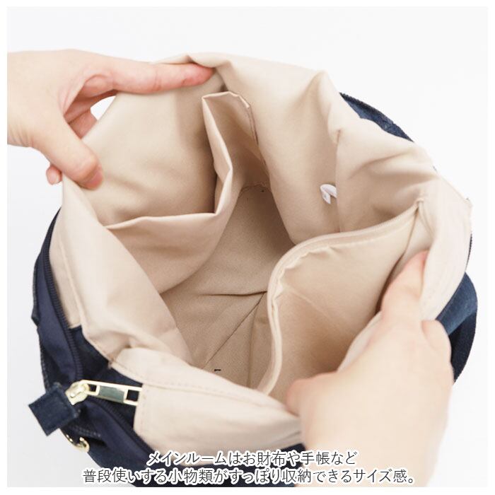 ・メインルームはお財布や手帳など普段使いする小物類がすっぽり収納できるサイズ感。さらにオープンポケットとファスナーポケットを各1ずつ装備。