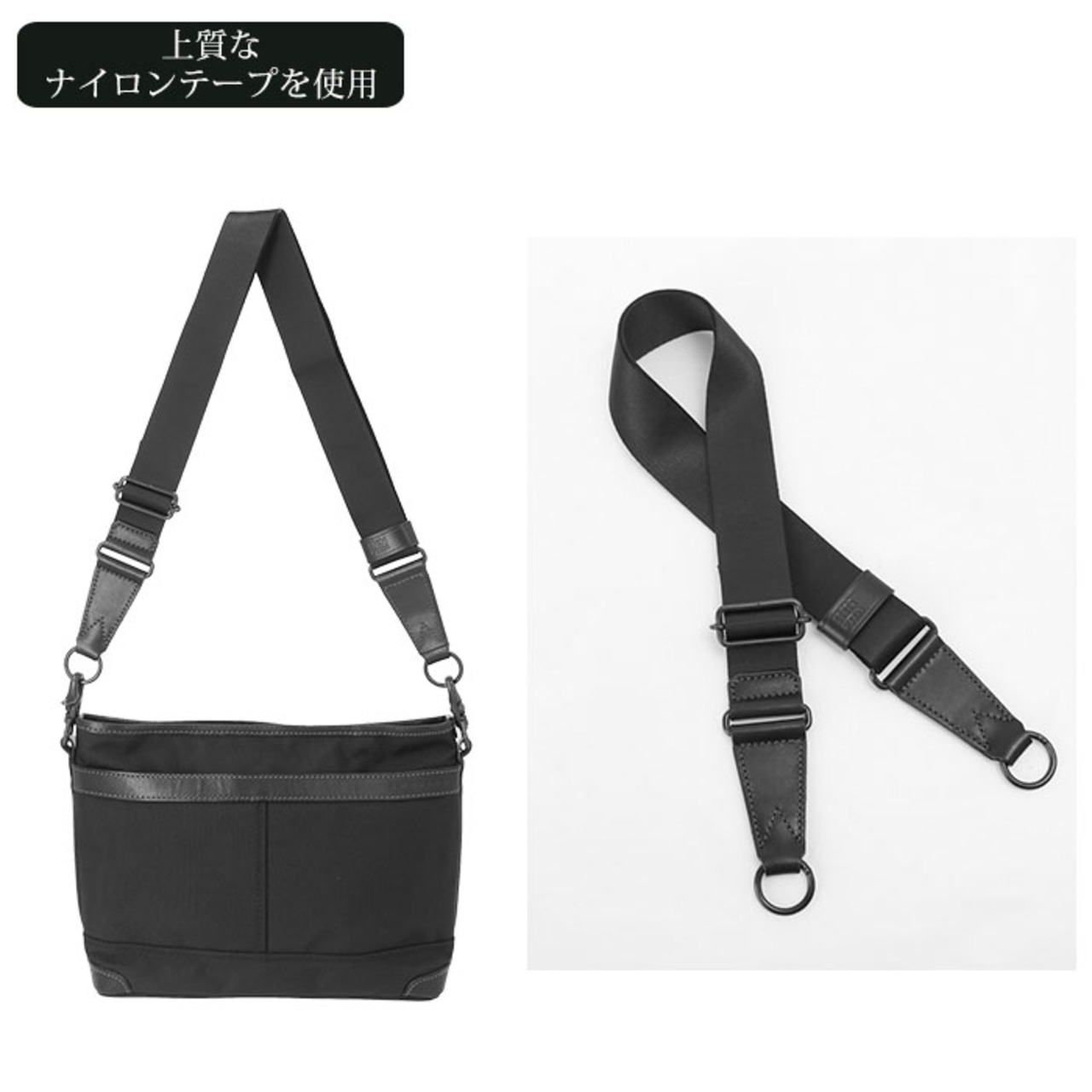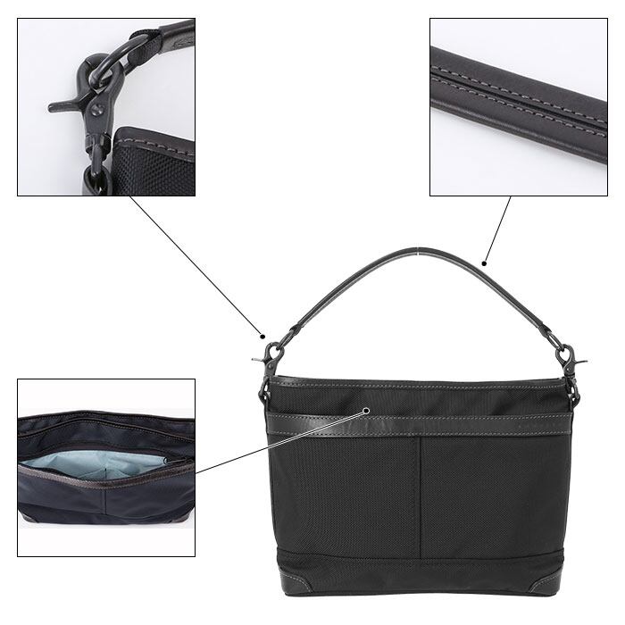 ・メインファスナー、金具類は、シックなブラックカラー。ストラップは上質なナイロンテープを使用。