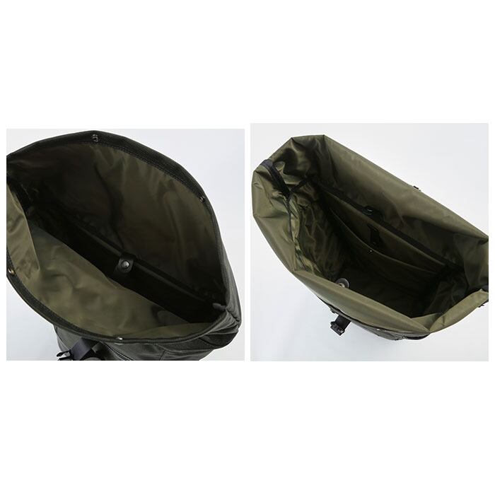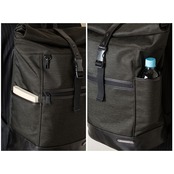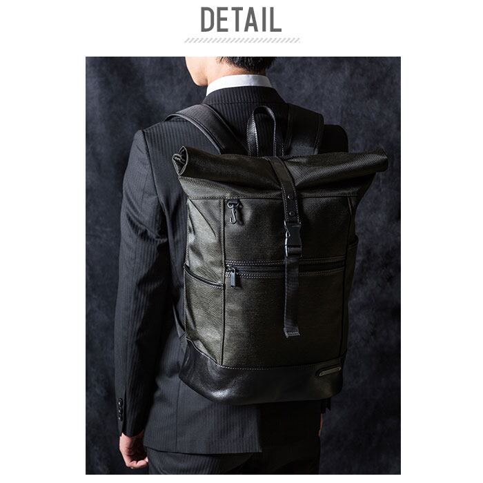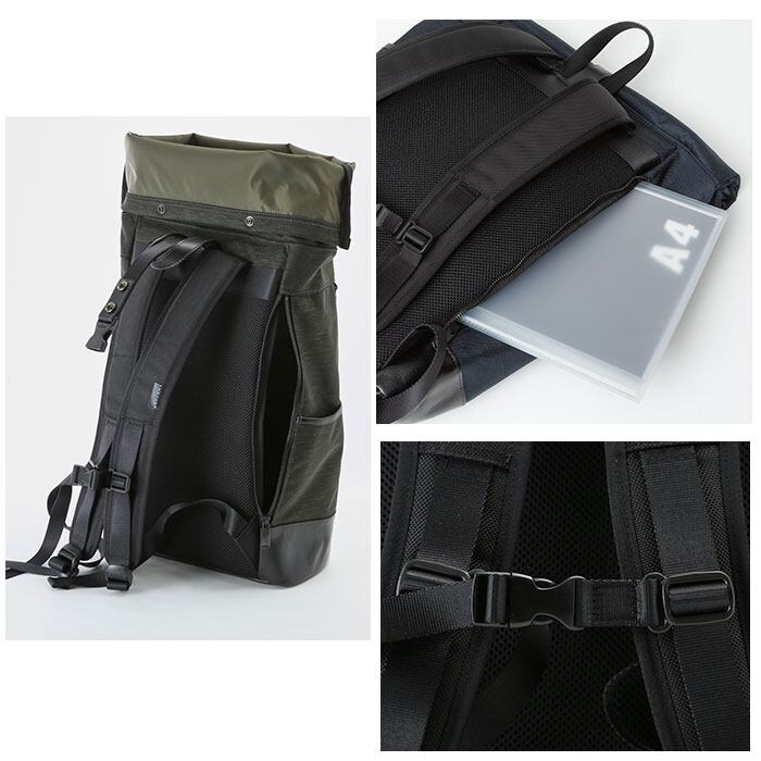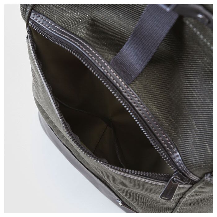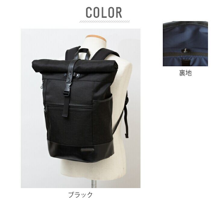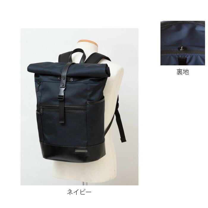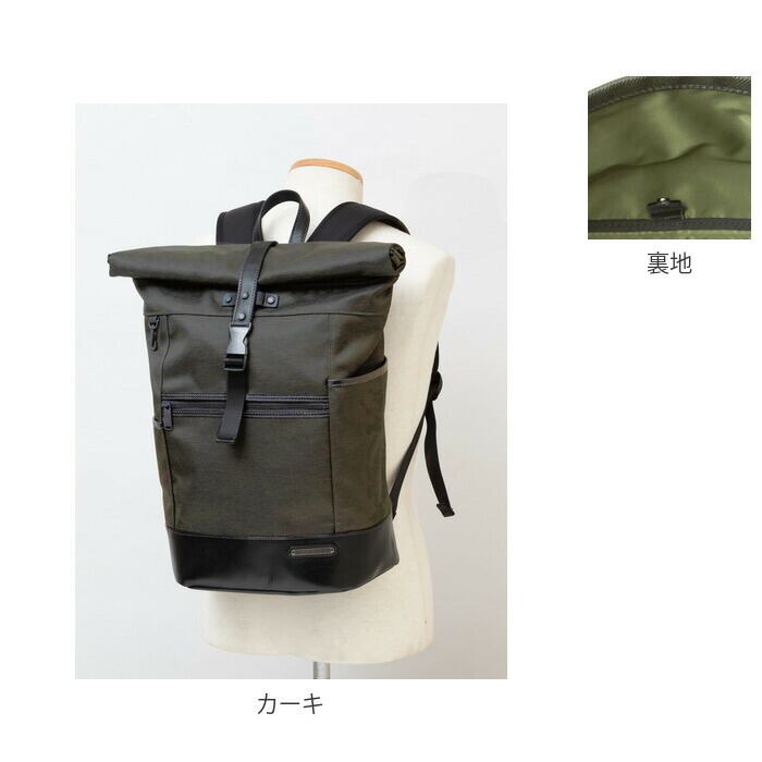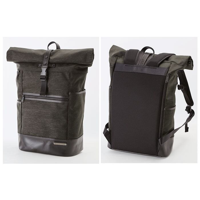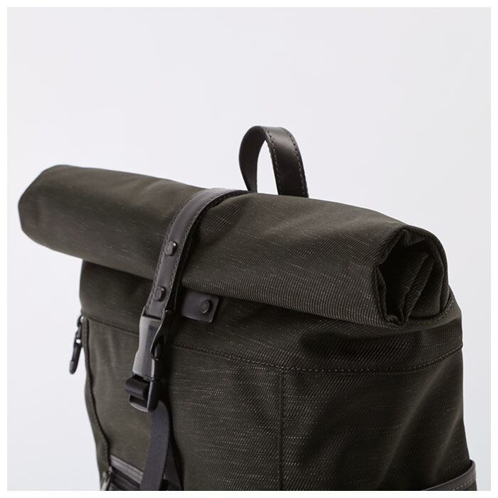 ・メイン素材には表情に味のある混紡生地、付属パーツに牛革を使用した、B4サイズが入るスタイリッシュなロールトップ型バックパック。