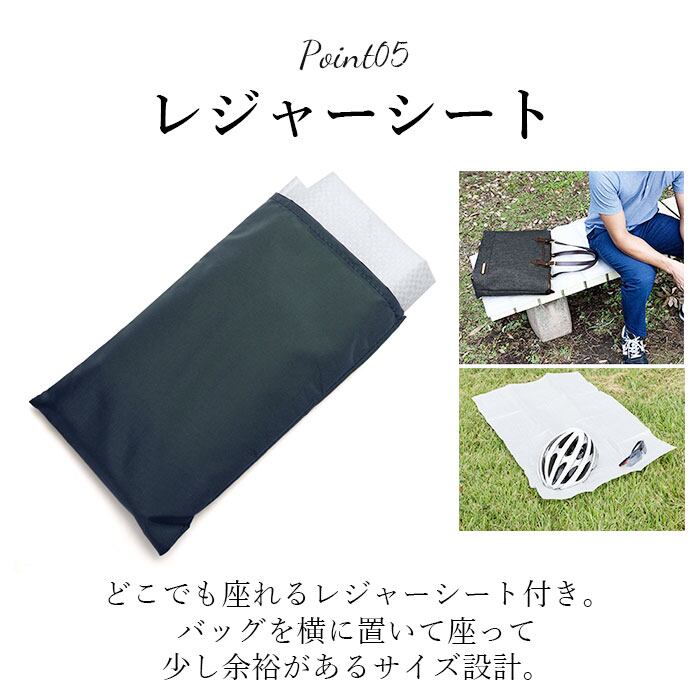 ・ビジネスマンにうれしいどこでも座れるレジャーシート付き。バッグを横に置いて座って少し余裕があるサイズ設計なのがうれしい!