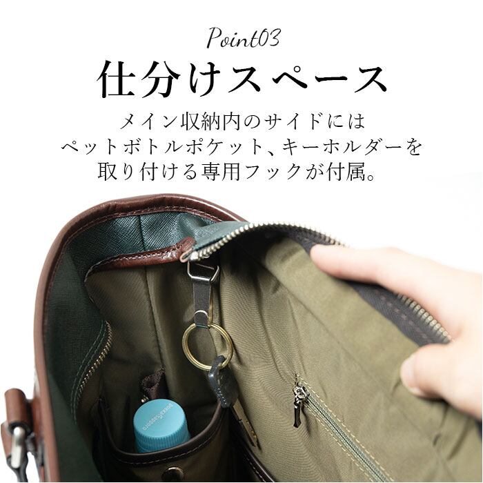 ・メイン収納内のサイドにはペットボトルポケット、キーホルダーを取り付ける専用フックが付属。