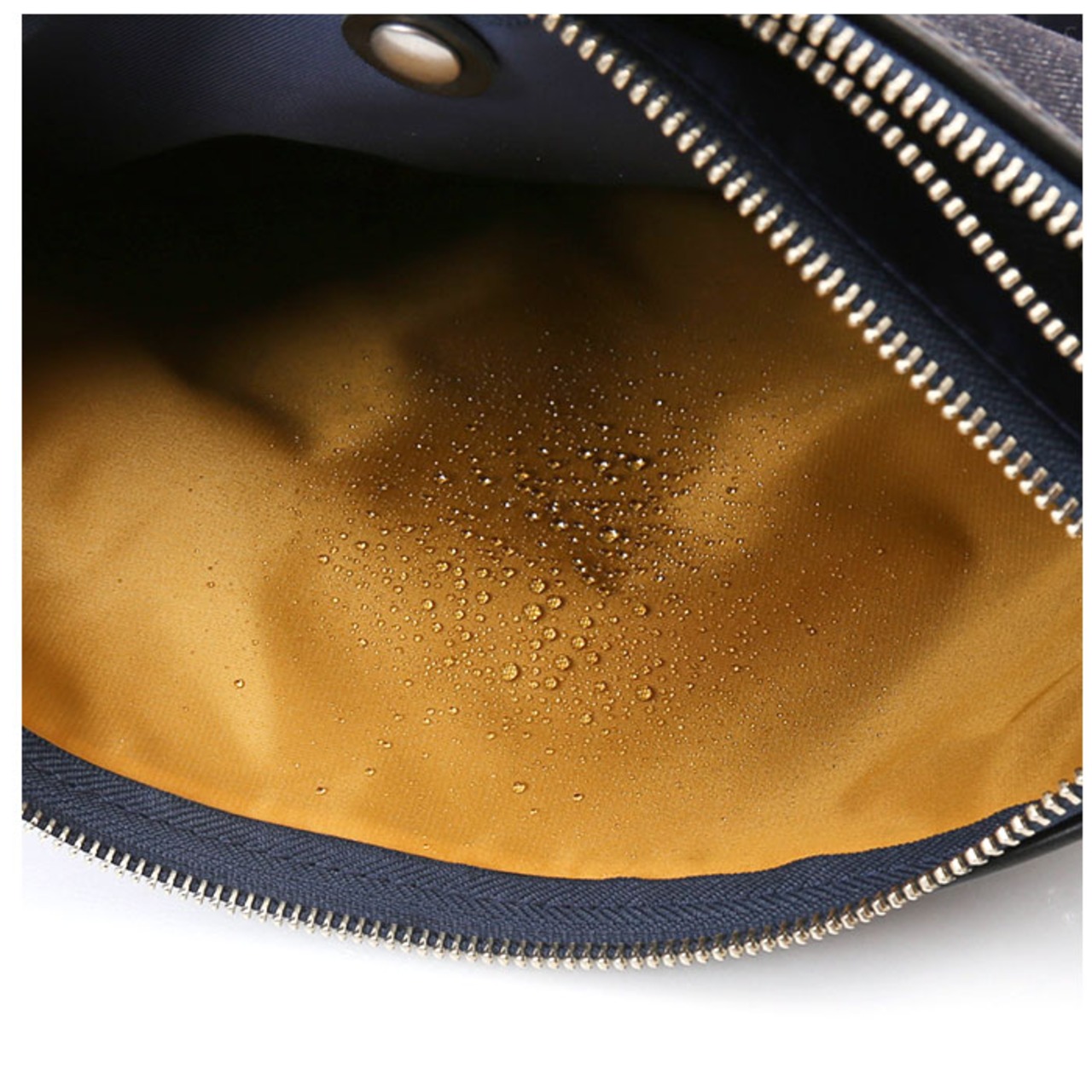 ・デニム生地裏にはPVCコーティングを施し、マスタードカラーの裏地にもはっ水製の高いナイロンを採用。急な通り雨にあった時もサッと水滴が拭き取れる。