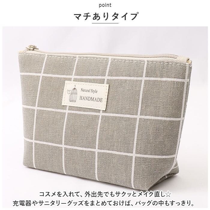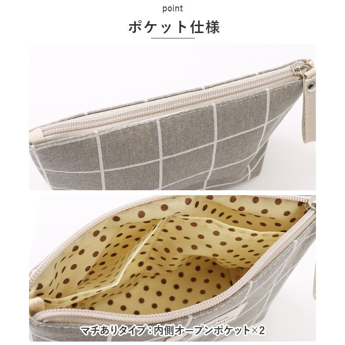 ・コスメを入れて、外出先でもサクッとメイク直し☆充電器やサニタリーグッズをまとめておけば、バッグの中もすっきり。オープンポケット×2付き。
