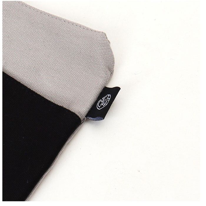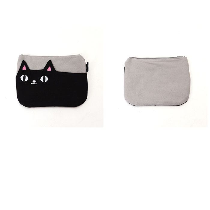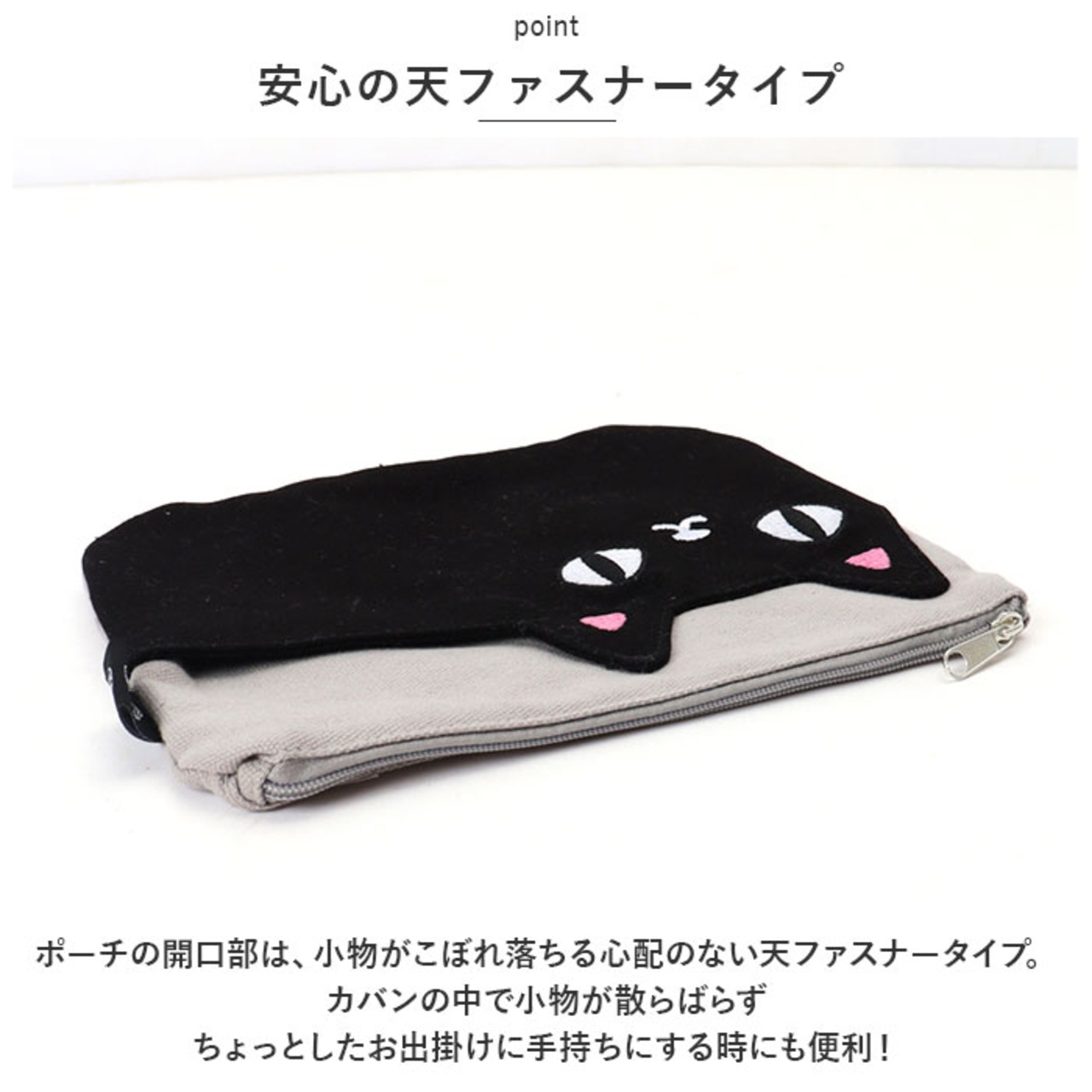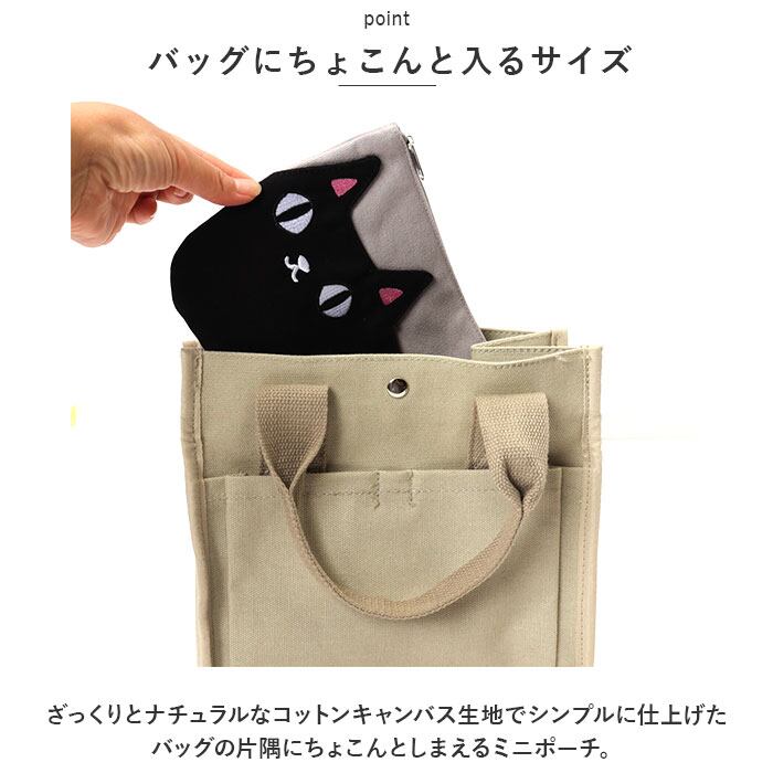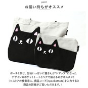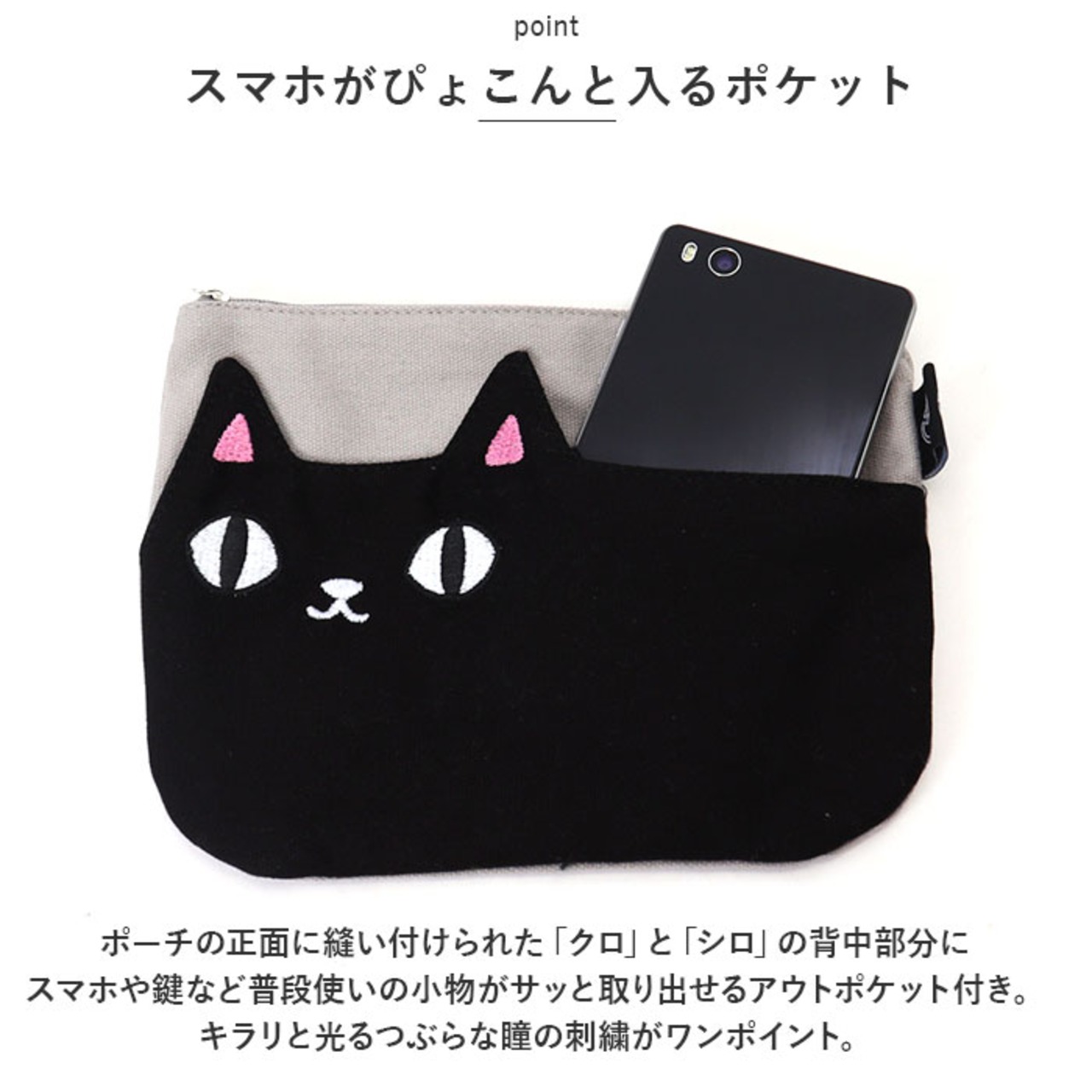 ・ポーチの正面に縫い付けられた「クロ」と「シロ」の背中部分に、スマホや鍵など普段使いの小物がサッと取り出せるアウトポケット付き。キラリと光るつぶらな瞳の刺繍がワンポイント。