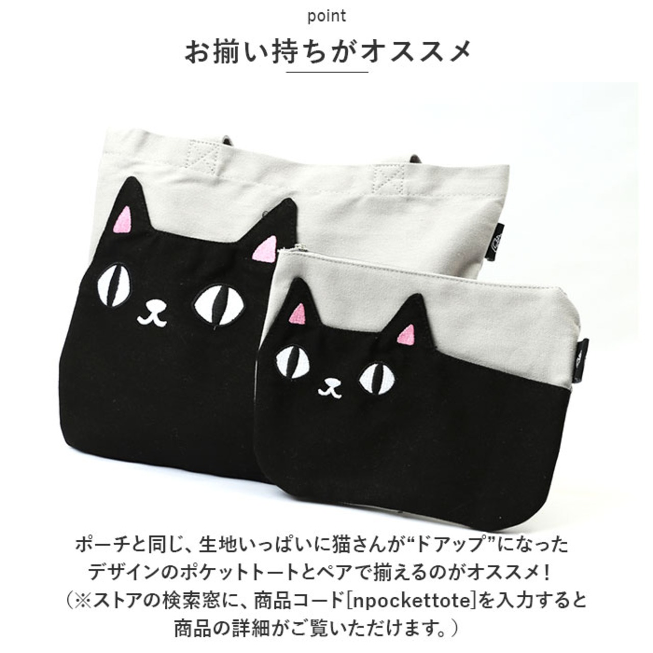・ポーチと同じ、生地いっぱいに猫さんが“ドアップ”になったデザインのポケットトートとペアで揃えるのがオススメ!(※ストアの検索窓に、商品コード[npockettote]を入力すると、商品の詳細がご覧いただけます。)