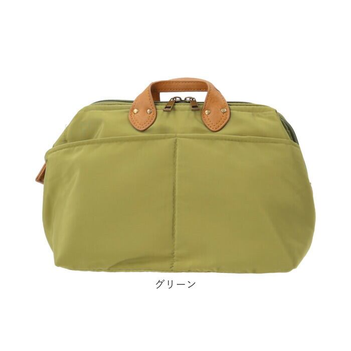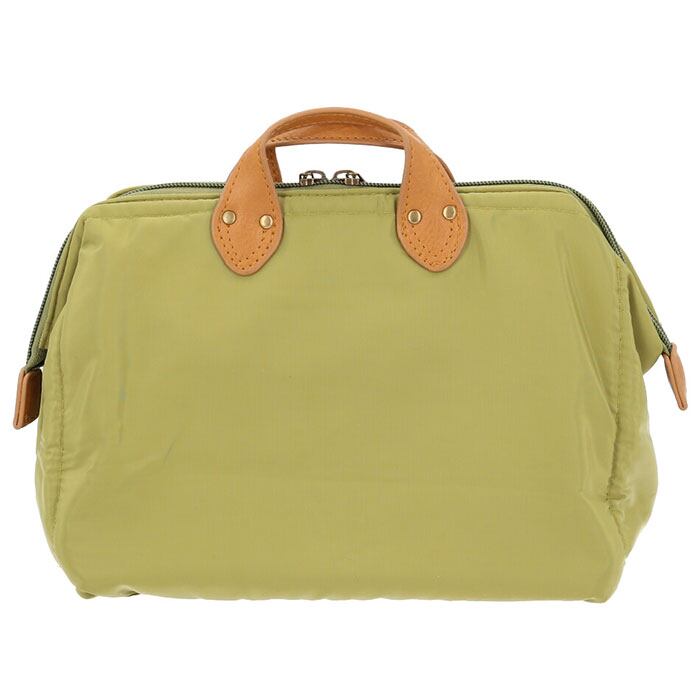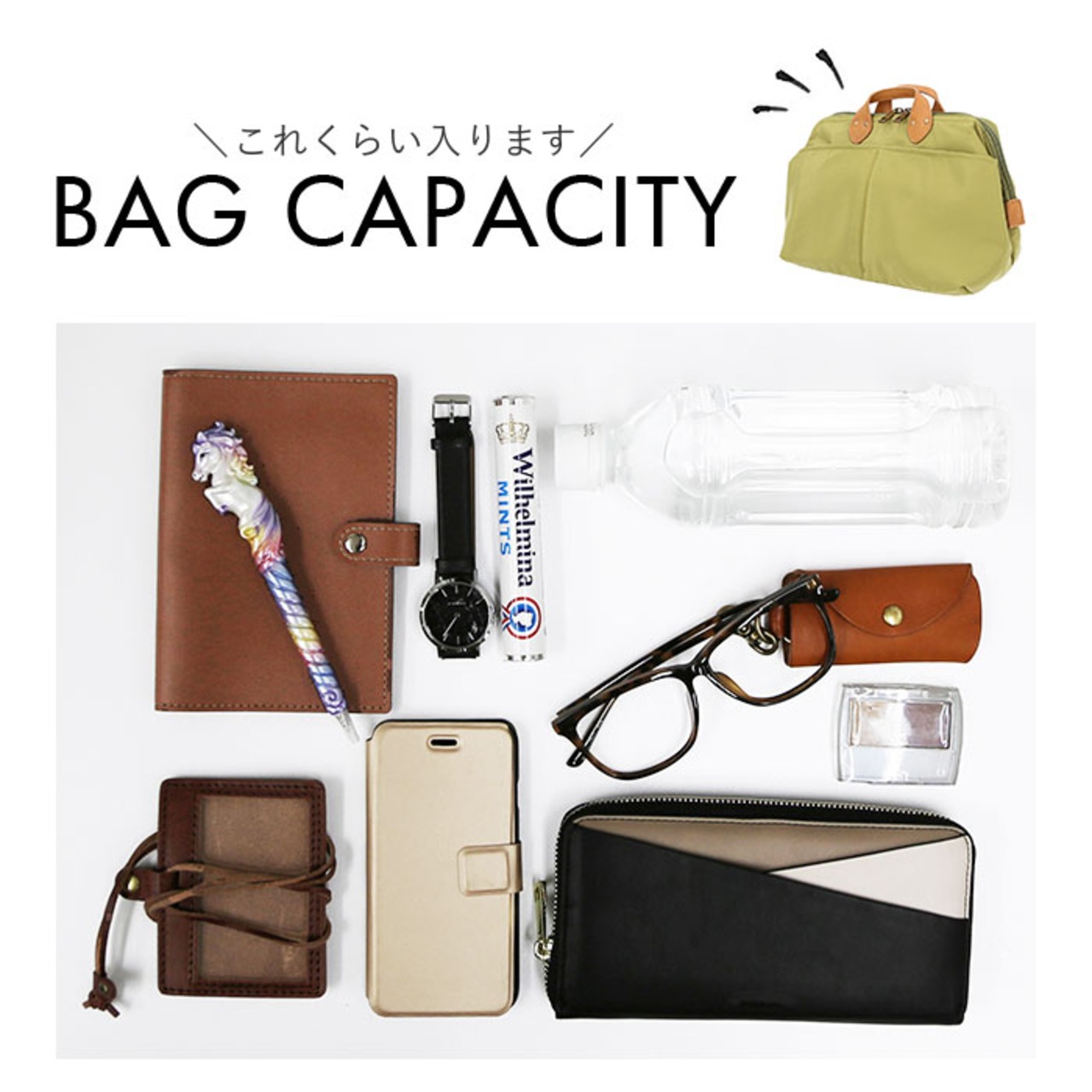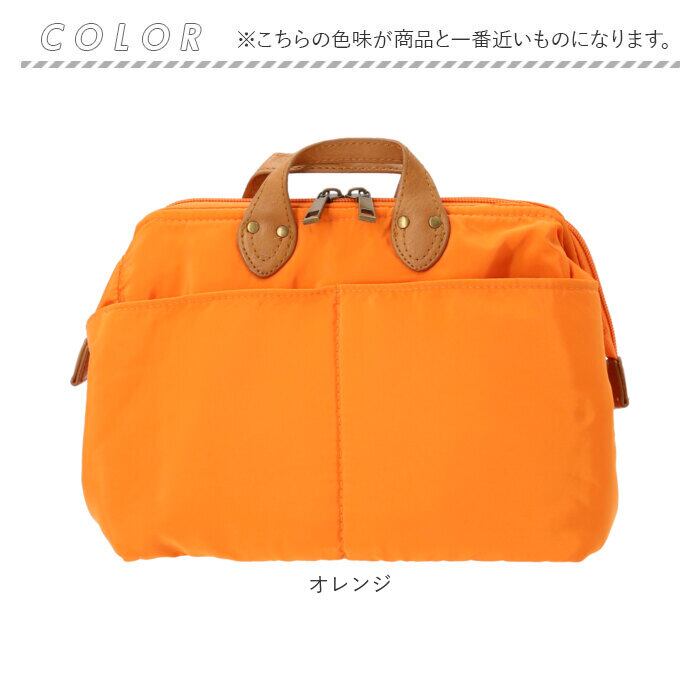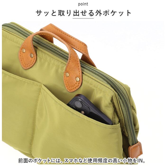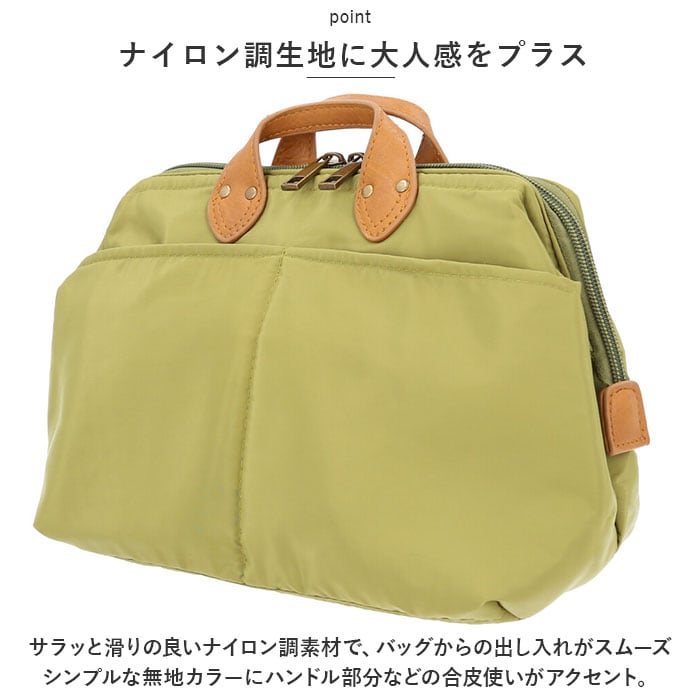 ・サラッと滑りの良いナイロン調素材で、バッグからの出し入れがスムーズ。シンプルな無地カラーにハンドル部分などの合皮使いがアクセント。