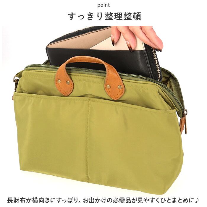 Lafiel ラフィール バッグインバッグ ポーチ 通販 サブバッグ バッグインバック サブバック ミニ手提げ ミニ 仕切リ ナイロン調 開口部 ワイヤー ポケット キーホルダー 合皮 光沢 ブランド 機能性抜群 おしゃれ