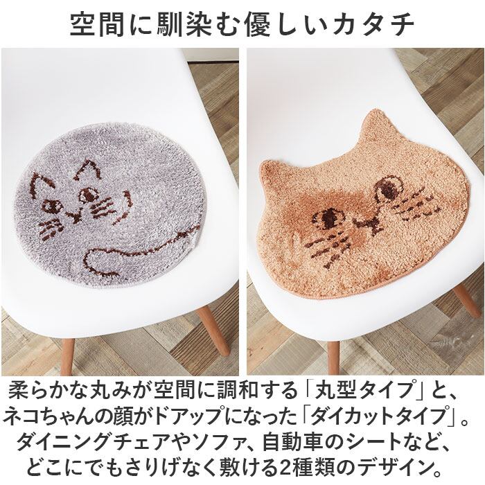 ・柔らかな丸みが空間に調和する「丸型タイプ」と、ネコちゃんの顔がドアップになった「ダイカットタイプ」。ダイニングチェアやソファ、自動車のシートなど、どこにでもさりげなく敷ける2種類のデザイン。