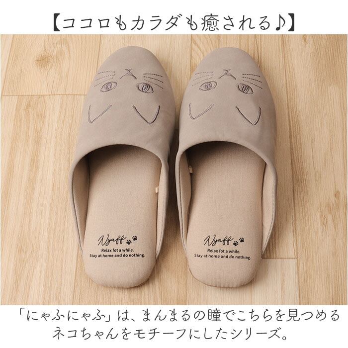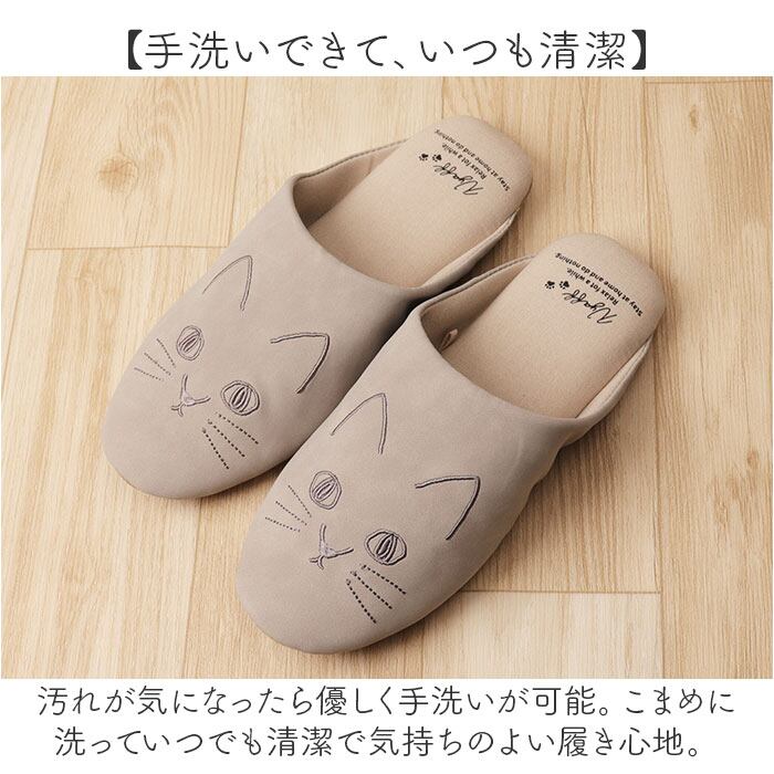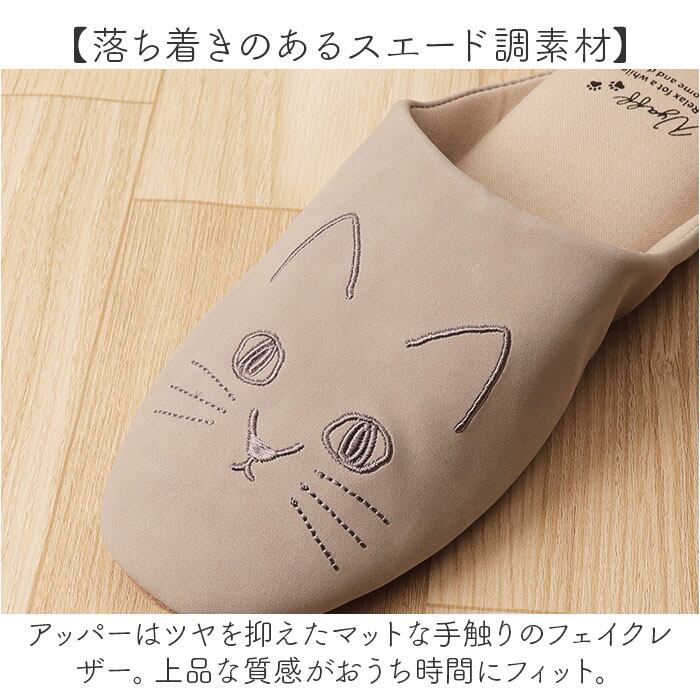 ・お澄まし顔のネコちゃんの刺繍がアクセント!「にゃふにゃふ フェイクレザー刺繍スリッパ」