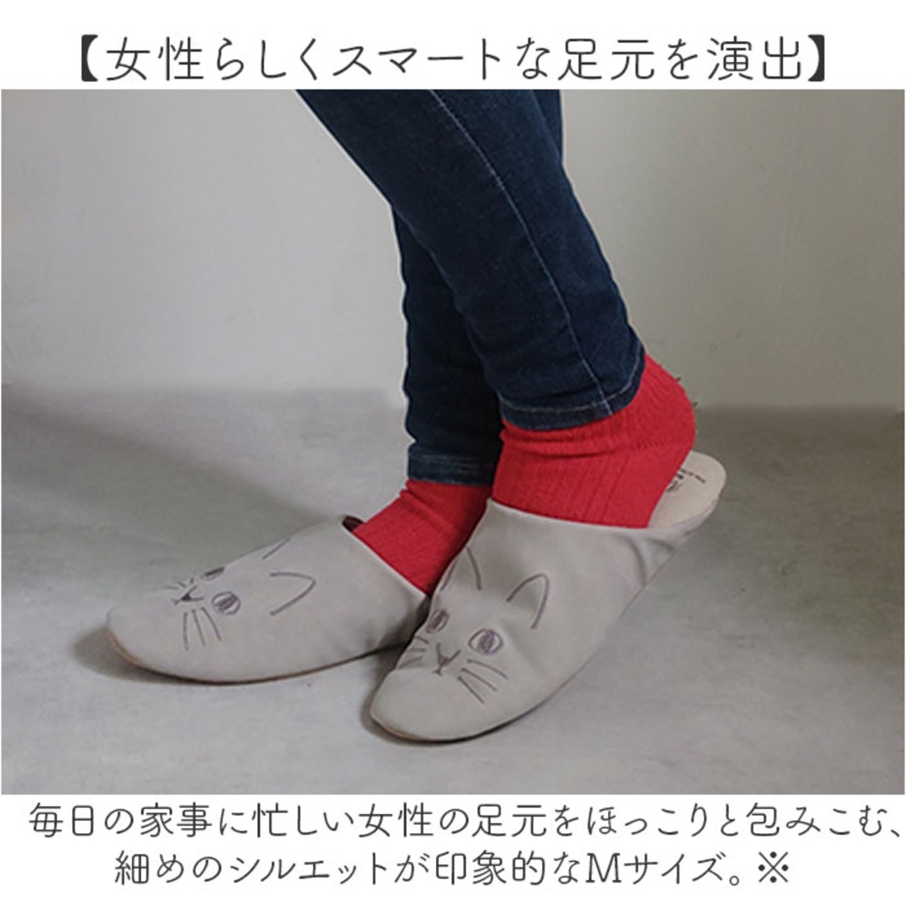 ・毎日の家事に忙しい女性の足元をほっこりと包みこむ、細めのシルエットが印象的なMサイズ。